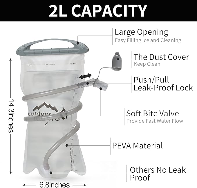 - đ´âăPremium Quality Water BladderăThe Hydration Pack Backpack comes with a 2 liter hydration water bladder and two 250ml soft flask. A switch valve and a cover cap make double leak-proof. Large opening allows quick filling of water and ice and it is easy to clean, the water line (40"length,0.4"diameter) provides a wholesome flow for easy drinking keeps your water tasting fresh, all day. The water temperature is range -20~+50â.