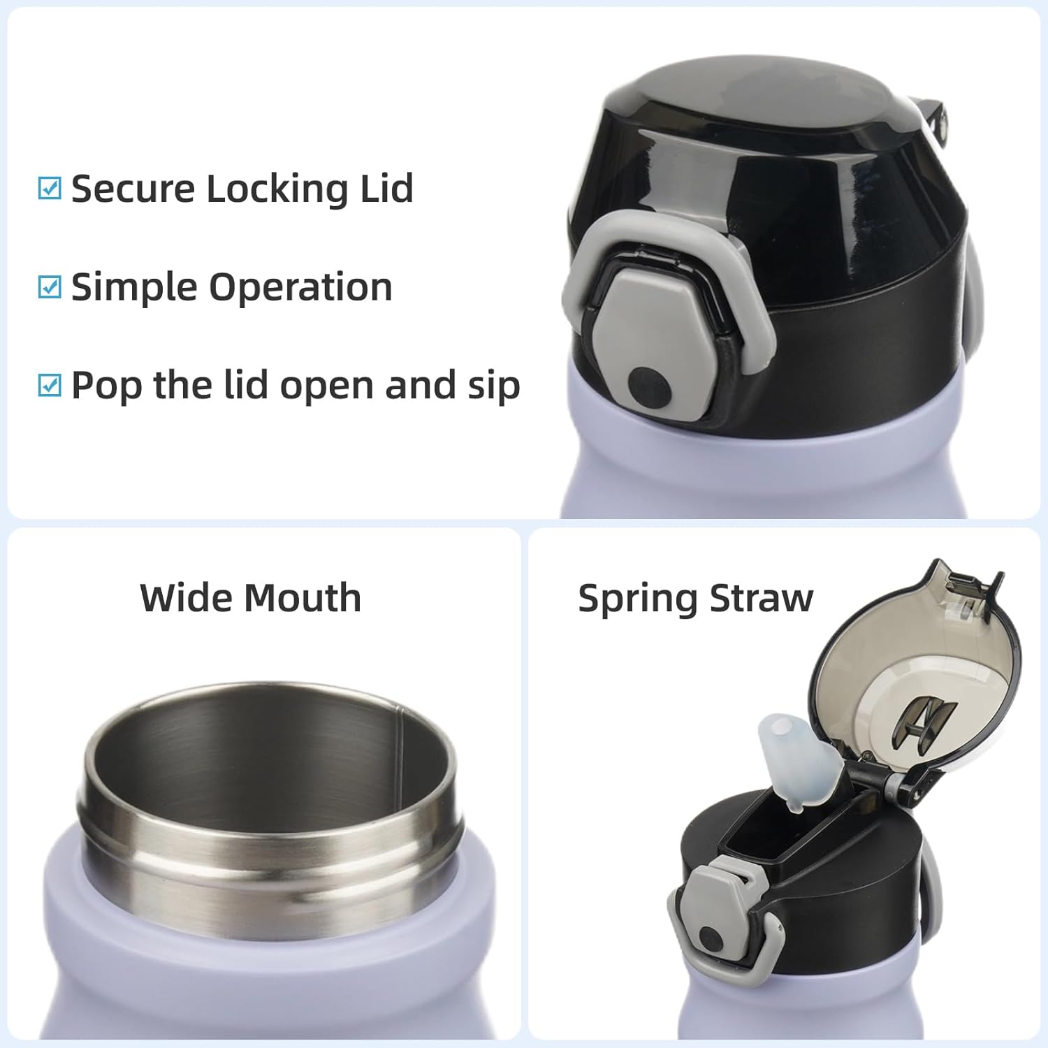 - Equipped with a lockable flip lid and a spring straw, the bottle is leak-proof,left it in your bag without worrying any spills. Simple operation design ensures you Just pop the lid open and sip.Soft silicone spout makes a nice drinking experience.