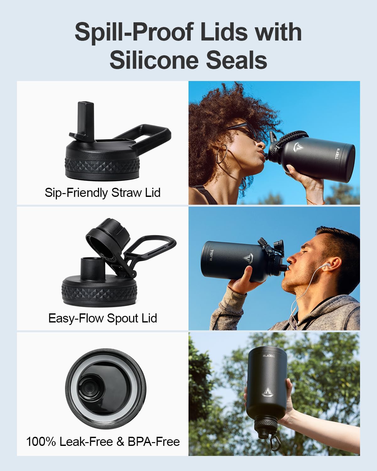 - Everything You Need: The package includes a comprehensive accessory set:Topre 64oz/128oz Water Bottle,two lids, a paracord handle, a carrying pouch, two straws and a straw brush.