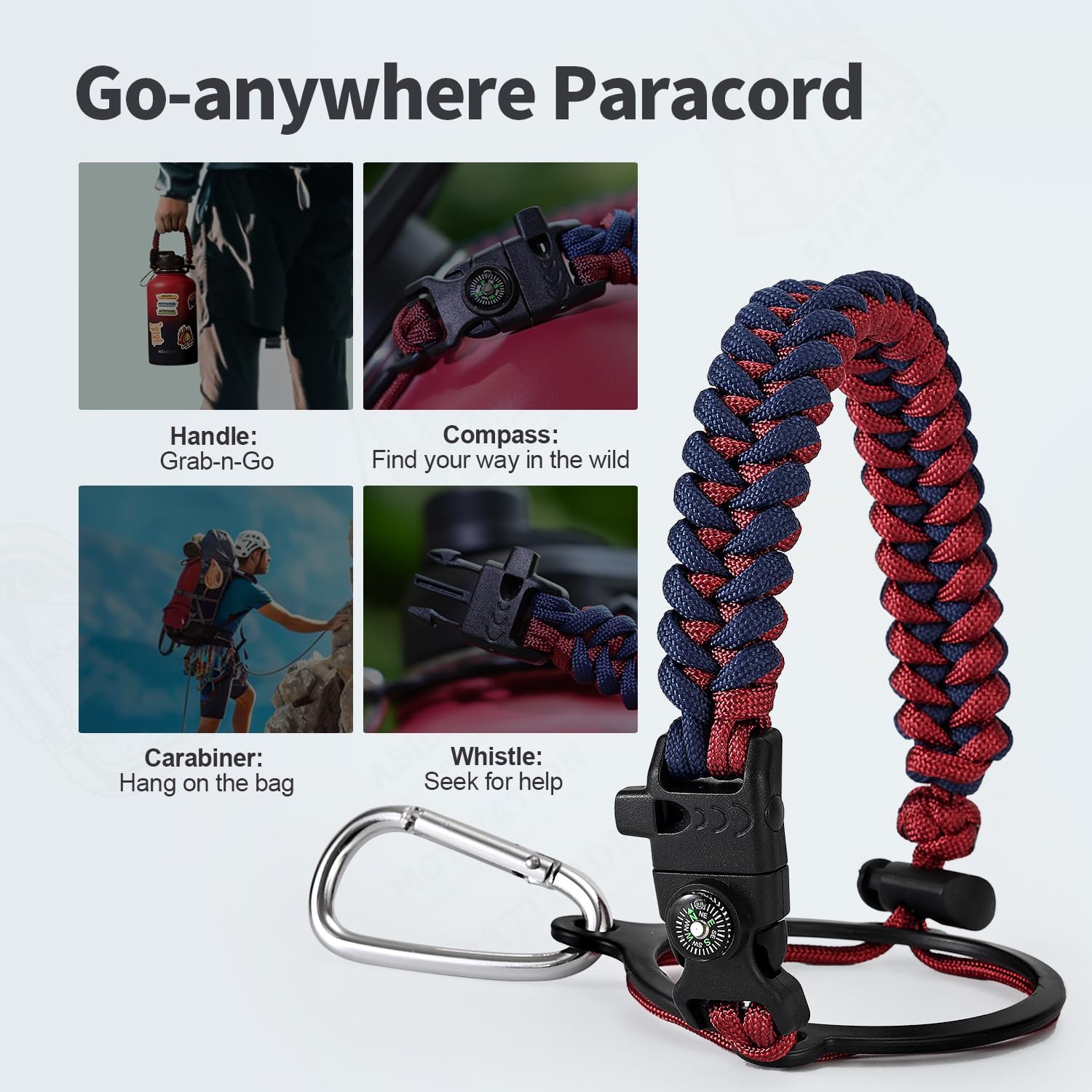 - Palm Fitting Paracord Handle: Compared to handle lids, nylon paracord on the bottle gives you more choices in terms of color coordination and coziness on your hands. Match the handle with your bottle to make a complete outdoorsy look. Compass and carabiner can be lifesavers for hiking and other expeditions