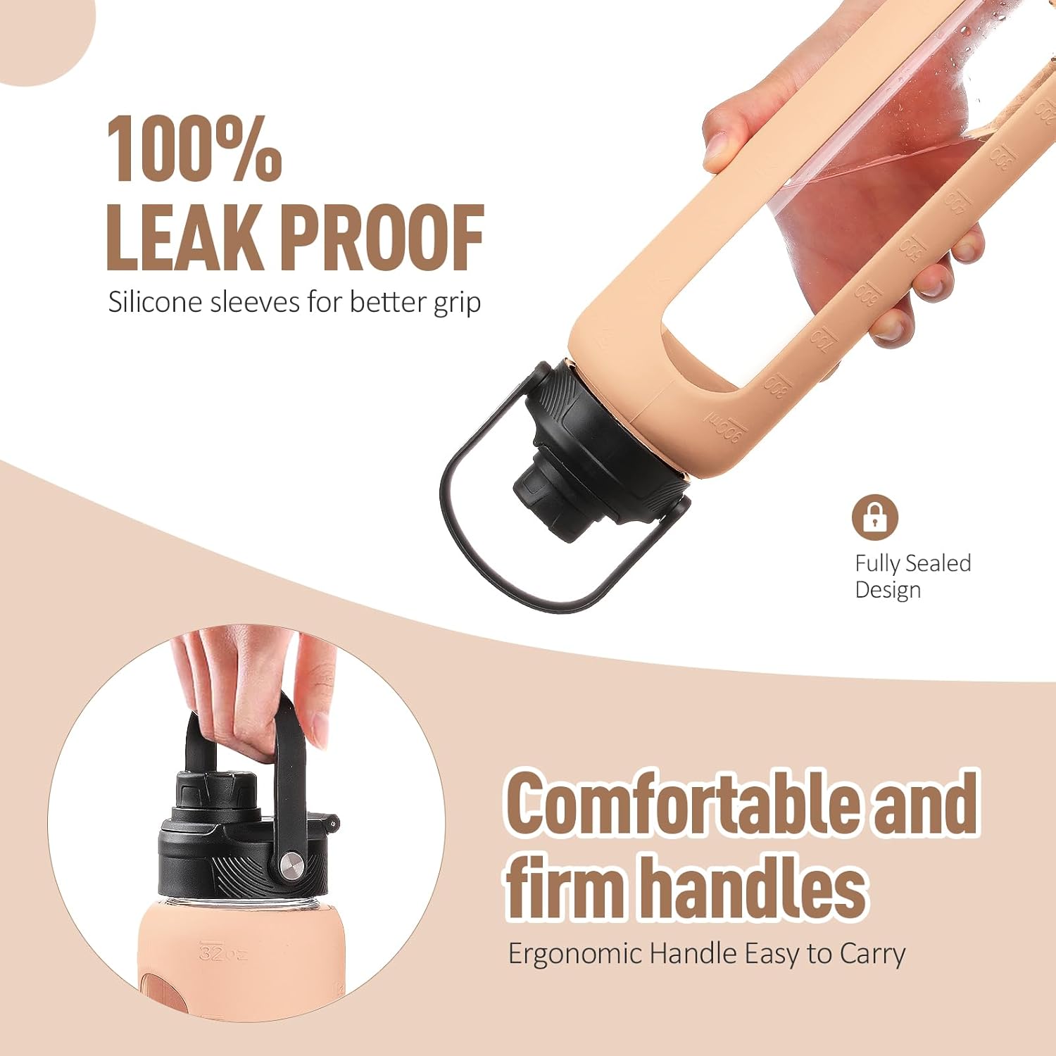 - WHAT YOU'LL GET - Our daily water intake bottle set comes with a water bottle covered with a silicone protective sleeve, 1 bamboo lid plus 1 spout lid with handle, 2 straws(1 stainless steel and 1 tritan), and 1 straw cleaning brush. You can switch between the two lids according to the occasion and preferences. If there is any problem with your water bottle glass or the lid is damaged within 6 months, you can contact us at any time for a replacement.