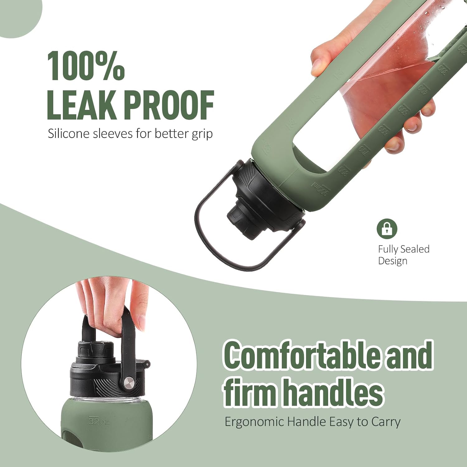 - WHAT YOU'LL GET - Our daily water intake bottle set comes with a water bottle covered with a silicone protective sleeve, 1 bamboo lid plus 1 spout lid with handle, 2 straws(1 stainless steel and 1 tritan), and 1 straw cleaning brush. You can switch between the two lids according to the occasion and preferences. If there is any problem with your water bottle glass or the lid is damaged within 6 months, you can contact us at any time for a replacement.