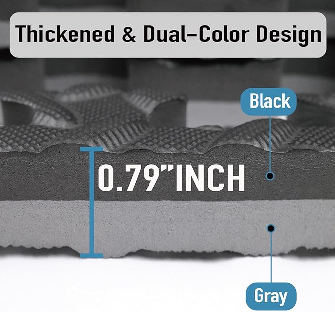- High-Density Thickened Design: Upgraded to a thickness of 0.79 inches, this mat features high-quality, reliable materials with high-density EVA foam. It offers comfortable and durable support, providing superior cushioning and shock absorption while reducing noise.