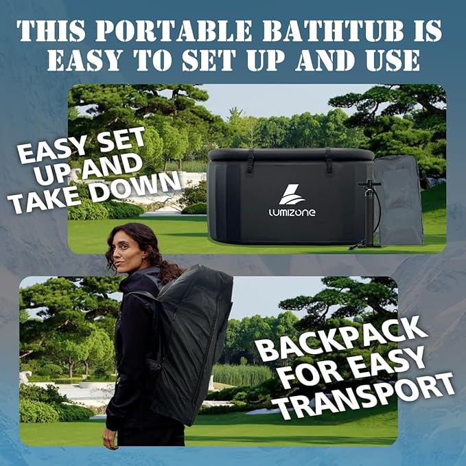 - COMPLETE COLD WATER BATH SET : The set includes an inflatable tub, a secure lid, a backpack for easy transport, a pump, an inflatable tube and a repair kit. Setting up and transporting this portable cold bath is a breeze, allowing you to enjoy a cold bath wherever you go.