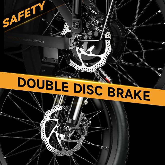 - šššš šš§š ššØš¦ššØš«šššš„š šš¢šš¢š§š : The electric bicycle adopts EABS power-off brake + front and rear double disc brakes for sensitive braking. It is designed with strong off-road performance, reliable braking force and high safety factor. High-strength shock-absorbing front fork and seatpost absorb the bumps of long, rough roads. The 20" fat tires are anti-slip and puncture-proof, ensuring you can ride like roads, snow, beaches, and rugged mountain roads.