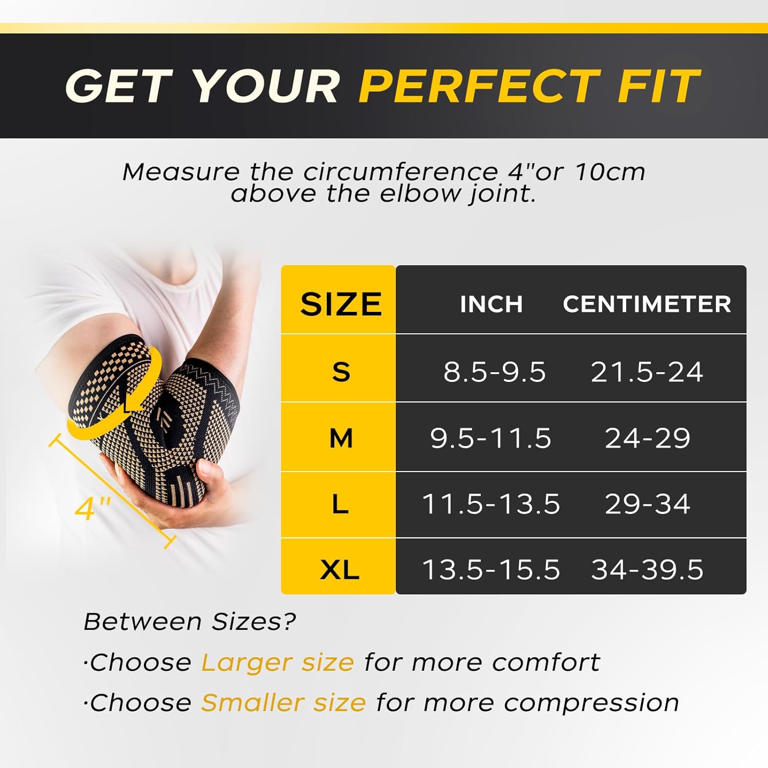 - Copper Elbow Brace: These tennis elbow brace for men and women is made of high-real copper ions directly infused fabric. It is breathable, comfortable, quickly sweat-absorbed for keeping your elbow dry & fresh, and helps improve blood circulation and prevent the elbow from injury.