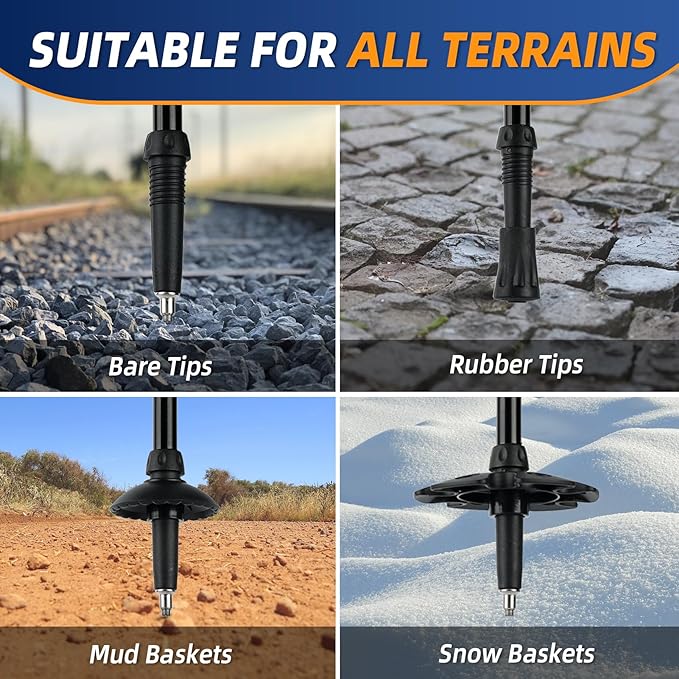 - PERFECT SERVICE: Each purchase includes 2 rubber tips, 2 snow baskets and 2 mud baskets to ensure seamless adaptation to snow, mud, uneven terrain and more. Lightweight and durable, these replacement tips will keep your hiking poles ready for any trail condition, so you never have to stop your trek. All products are covered by a one-year warranty against defects in materials and workmanship