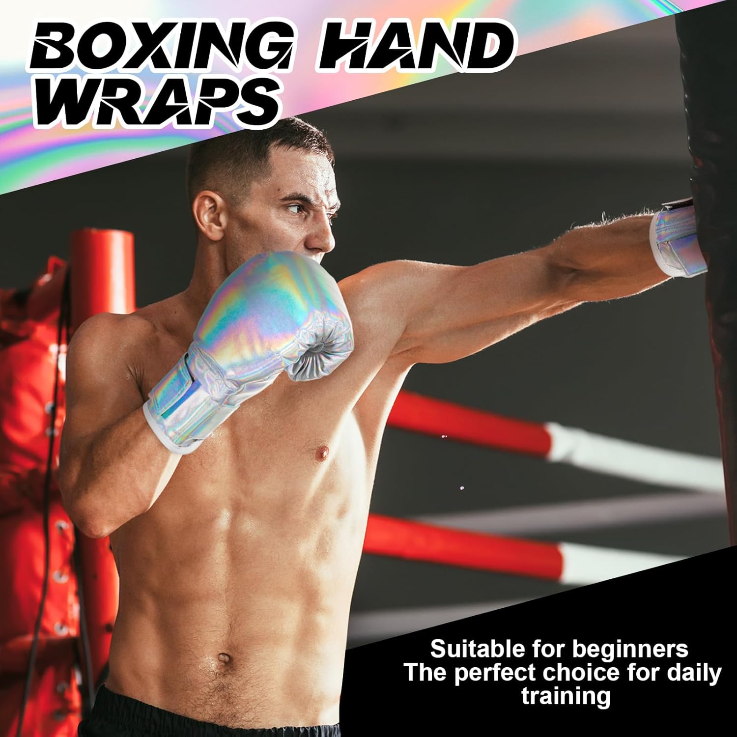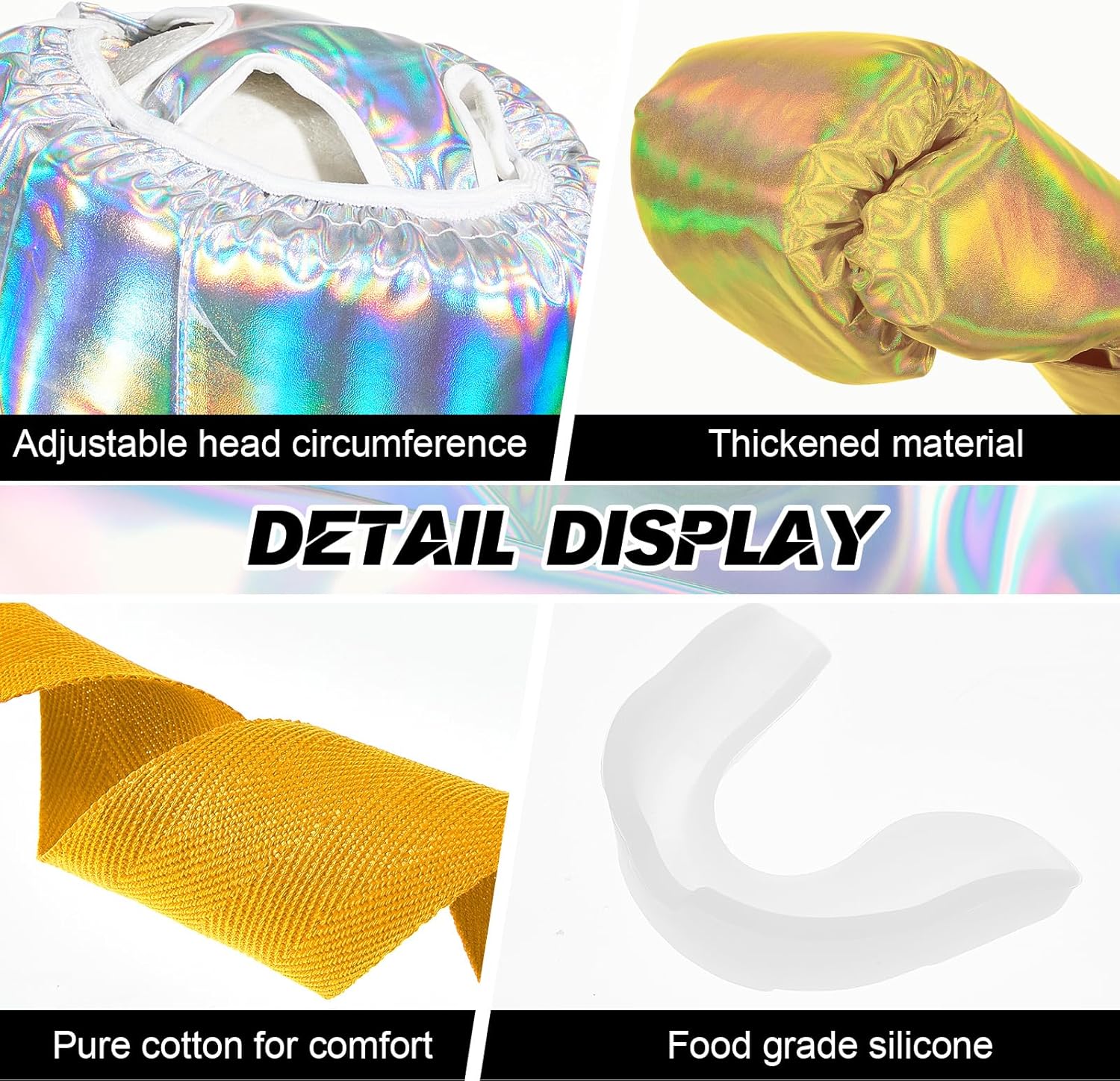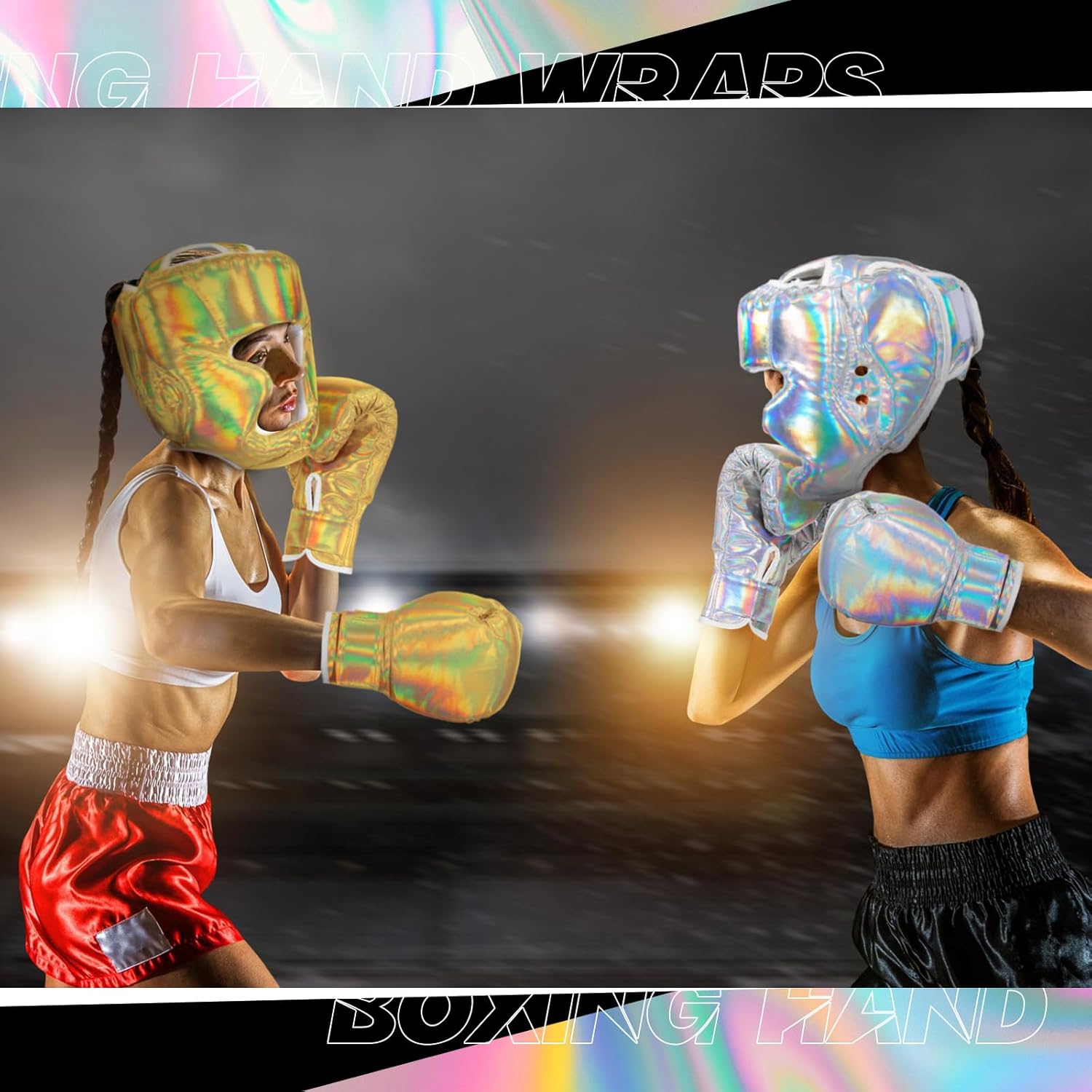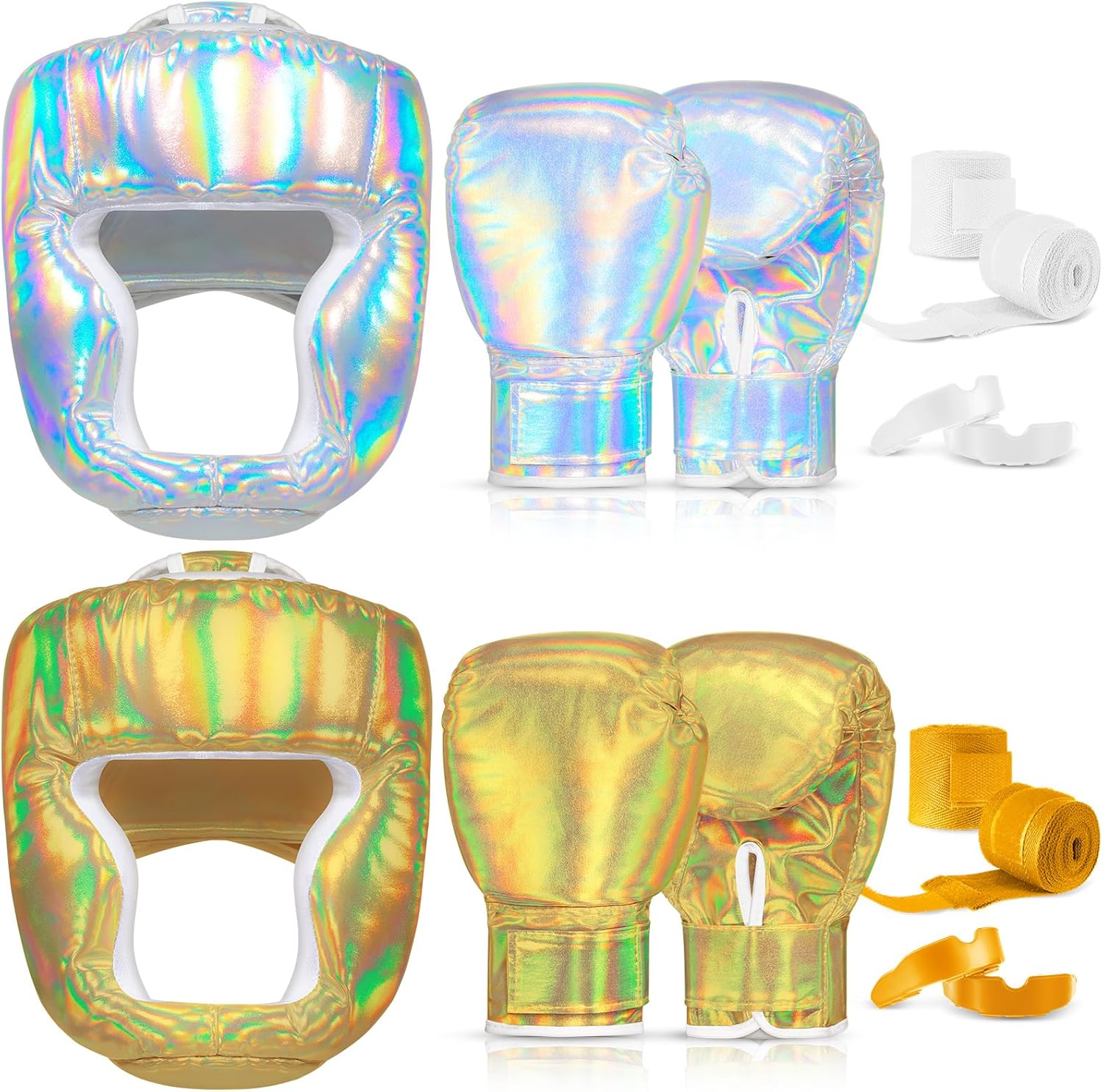 - Nice Combination for Beginners: the package will provide you with 2 sets of boxing gear respectively in holographic gold and holographic silver color, each set contains 1 piece of helmet, 1 pair of boxing gloves, 2 rolls of boxing hand wraps and 2 pieces of boxing mouth guards, offering you safety during training