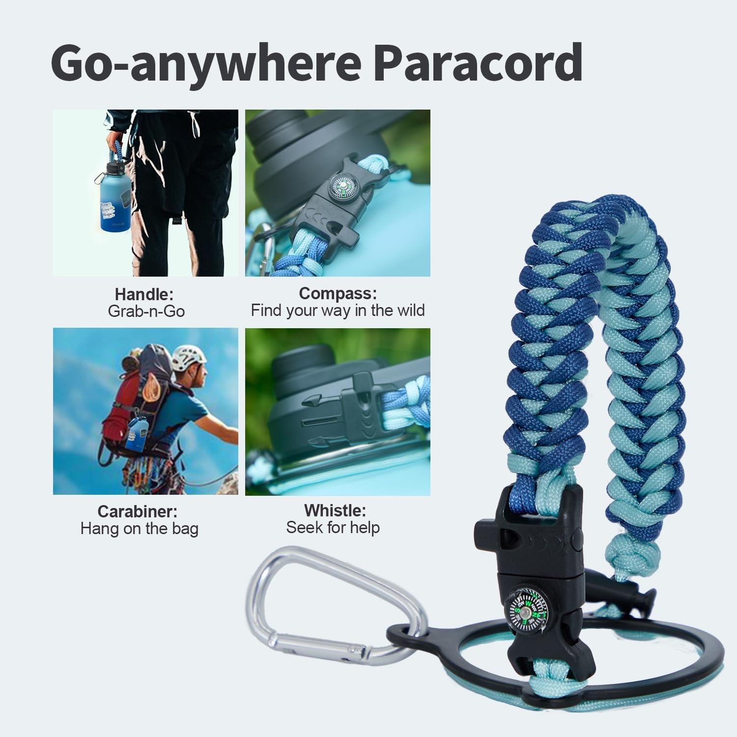 - Palm Fitting Paracord Handle: Compared to handle lids, nylon paracord on the bottle gives you more choices in terms of color coordination and coziness on your hands. Match the handle with your bottle to make a complete outdoorsy look. Compass and carabiner can be lifesavers for hiking and other expeditions
