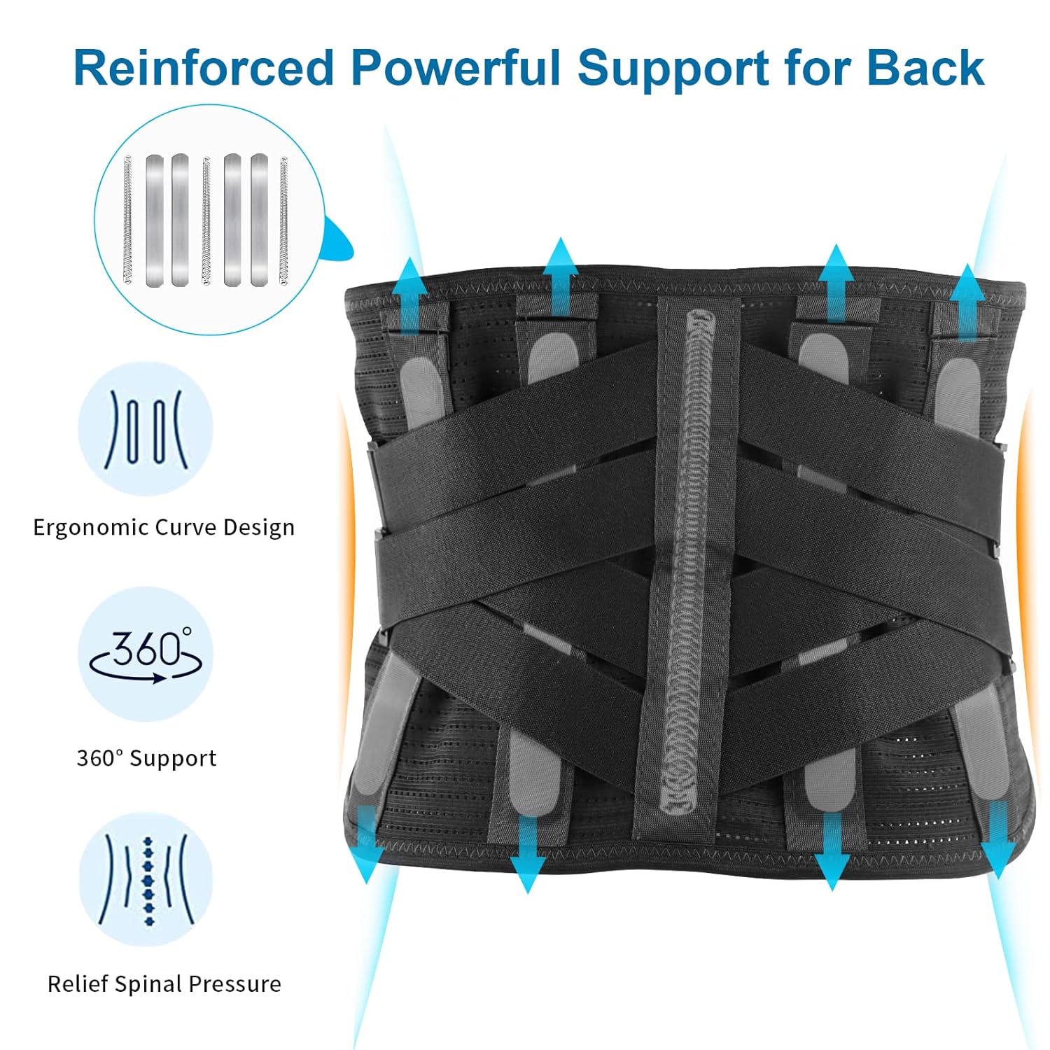 - 360°POWERFUL SUPPORT:The Lumbar support belt contains 4 Removable Stainless Steel Support Stays and 3 Steel Springs, which provide strong support for the Lower back, reduce the pressure on your lumbar spine, prevent excessive scoliosis of the spine, and restore the normal 26° physiological curvature.