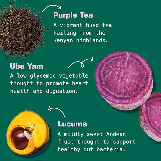 - BOOSTED WITH UBE YAM AND LUCUMA - Our superfood latte mix is enriched with Ube Yam, a nutrient-dense tuber that promotes heart health and supports digestion. Additionally, Lucuma, a mildly sweet Andean fruit, enhances gut health and adds a delightful flavor to this latte.