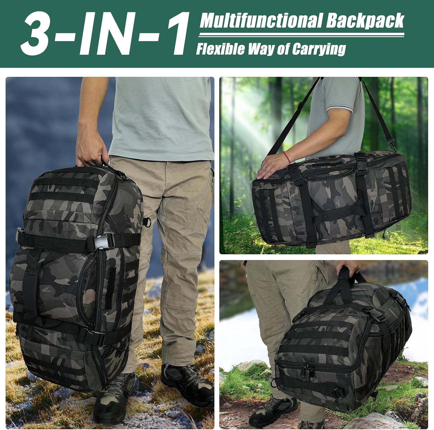 55L Large Duffle Bag, 3-in-1 Tactical Backpack MOLLE Pack for Gym, Sports, Outdoor, Black Camo
