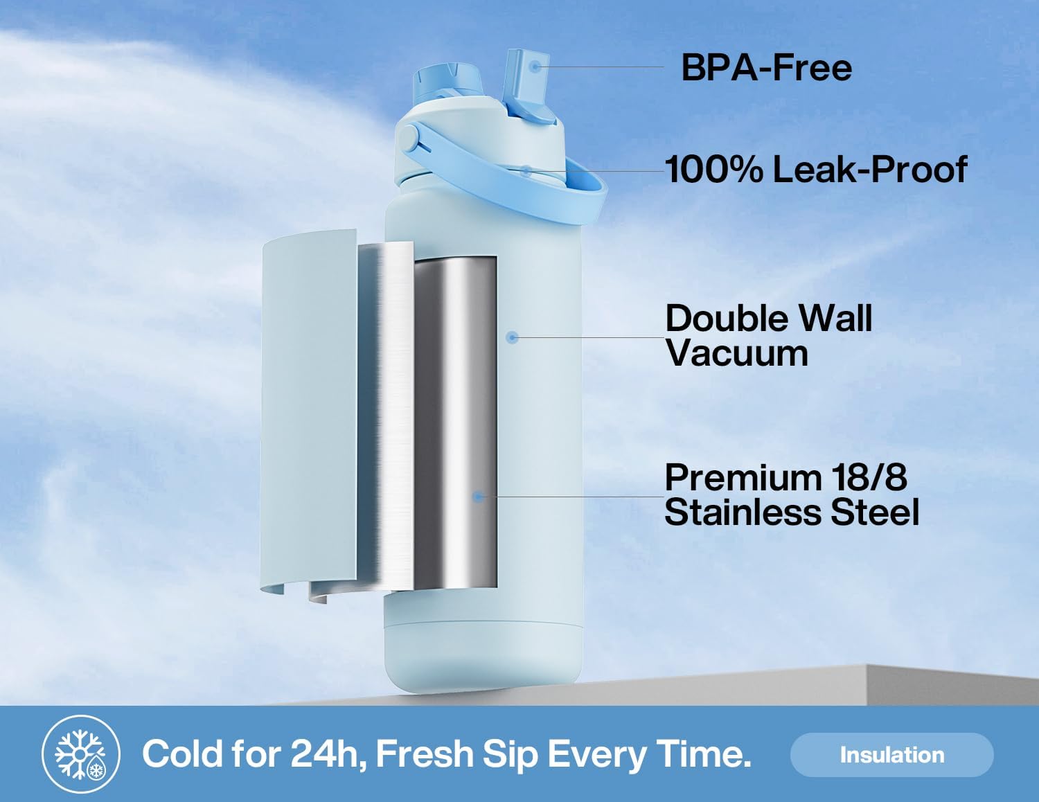 32 oz Insulated Water Bottle with 2-in-1 Straw and Spout Lid, Keep Cold 24H, Leak-Proof, BPA-Free, Double Wall Stainless Steel Water Bottle for Sports, Gym, Travel, and School (Sea Breeze)