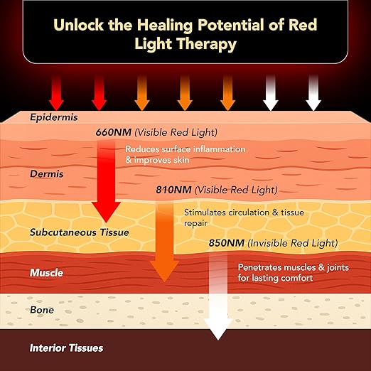 - BENEFITS OF RED LIGHT THERAPY — 660nm and 8100nm red light are effectively absorbed by the skin to improve skin appearance, boost collagen production, and speed up wound healing. 850nm near-infrared light penetrates deeper into muscles, joints, and tissues to enhance recovery, reduce inflammation, and relieve joint pain.