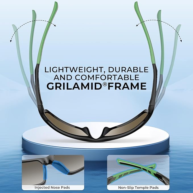 • KEY FEATURES – Impact-resistant polarized 1.0mm TAC lenses reduce glare, Block 100% of harmful UVA and UVB rays, Oleophobic and saltwater resistant lens coatings protect mirror finish, Full wrap frame design, Lightweight, durable, and comfortable Grilamid frames, Non-slip temple pads.