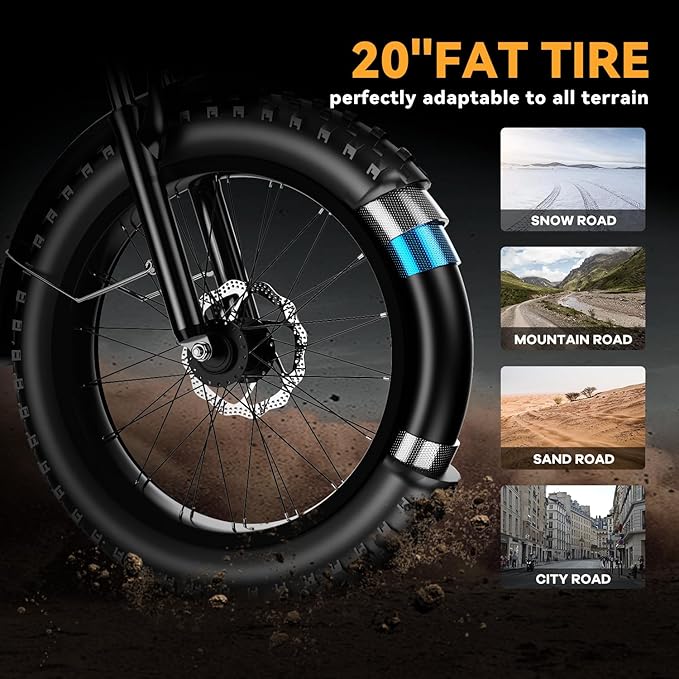 - šššš šš§š ššØš¦ššØš«šššš„š šš¢šš¢š§š : The electric bicycle adopts EABS power-off brake + front and rear double disc brakes for sensitive braking. It is designed with strong off-road performance, reliable braking force and high safety factor. High-strength shock-absorbing front fork and seatpost absorb the bumps of long, rough roads. The 20" fat tires are anti-slip and puncture-proof, ensuring you can ride like roads, snow, beaches, and rugged mountain roads.