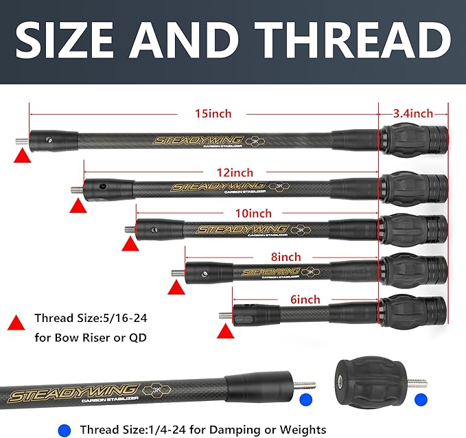- Versatile Design: This archery bow stabilizer set includes 6", 8", 10", 12",and 15" rods, allowing you to customize the balance and stability of your compound bow.