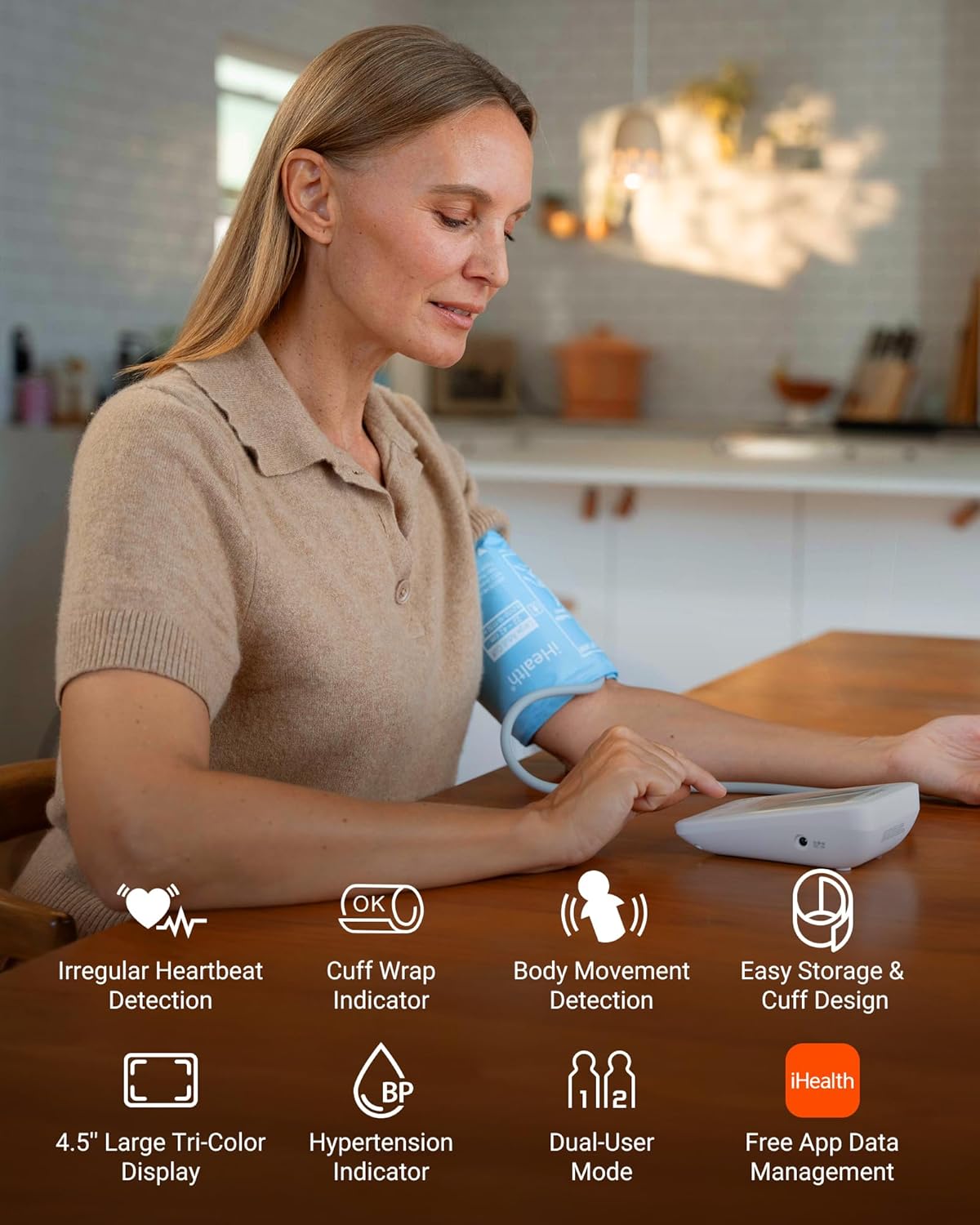 - Smart and Accurate Home Blood Pressure Monitoring: The iHealth Home Smart Blood Pressure Monitor delivers medical-grade accuracy with a cuff wrap indicator that ensures a perfect fit from the start. Additionally, advanced motion detection ensures reliable results during the measurement process. These features provide clinically accurate readings at home, making monitoring simple and effective without the need for doctor assistance.