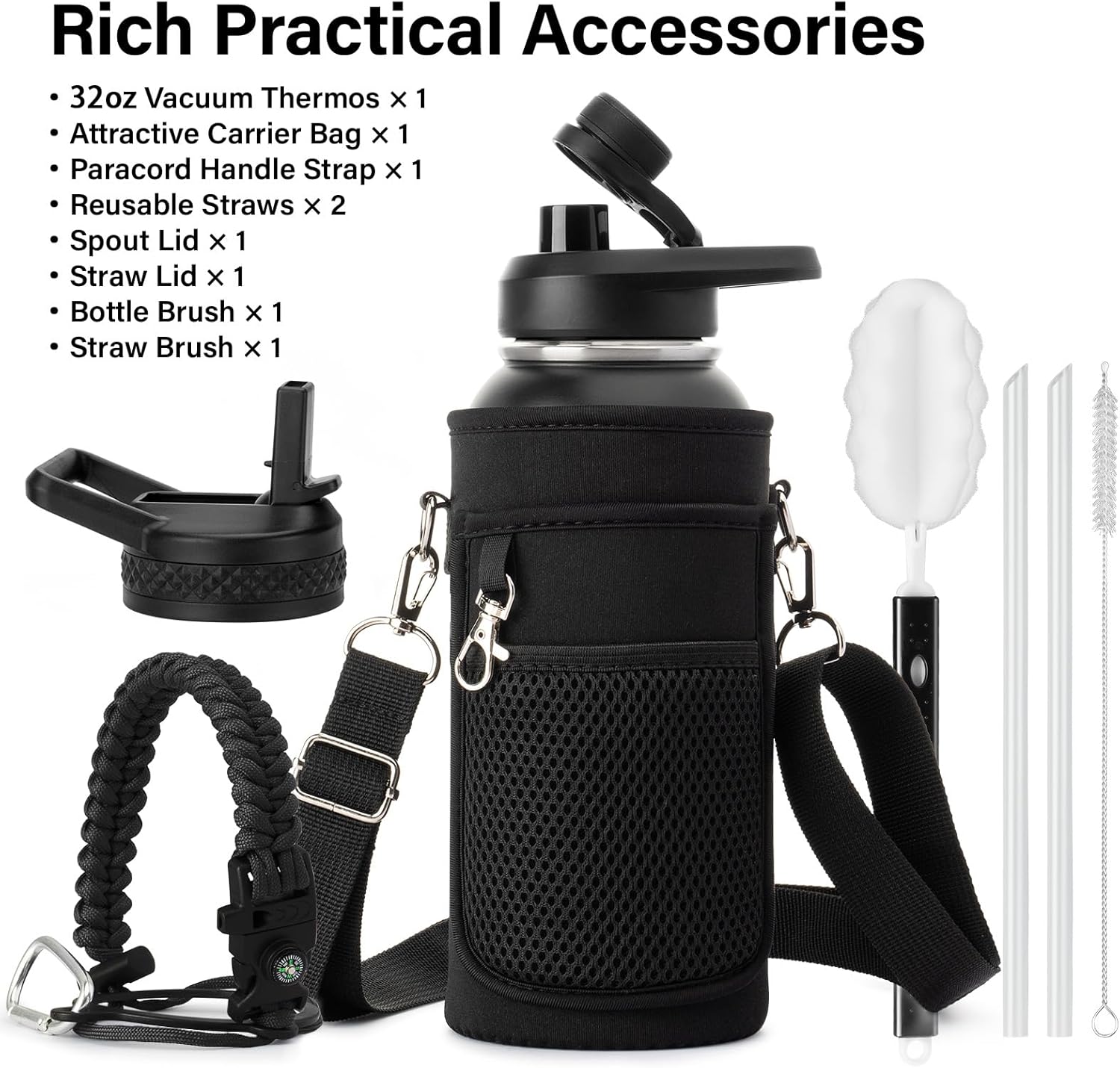32 oz Insulated Water Bottle | Thickened Stainless Steel Vacuum Metal | Portable Sports Water Jug for Gym and Hiking with Straw, Carrier Bag, Handle Strap | BPA-Free 32 oz, Black
