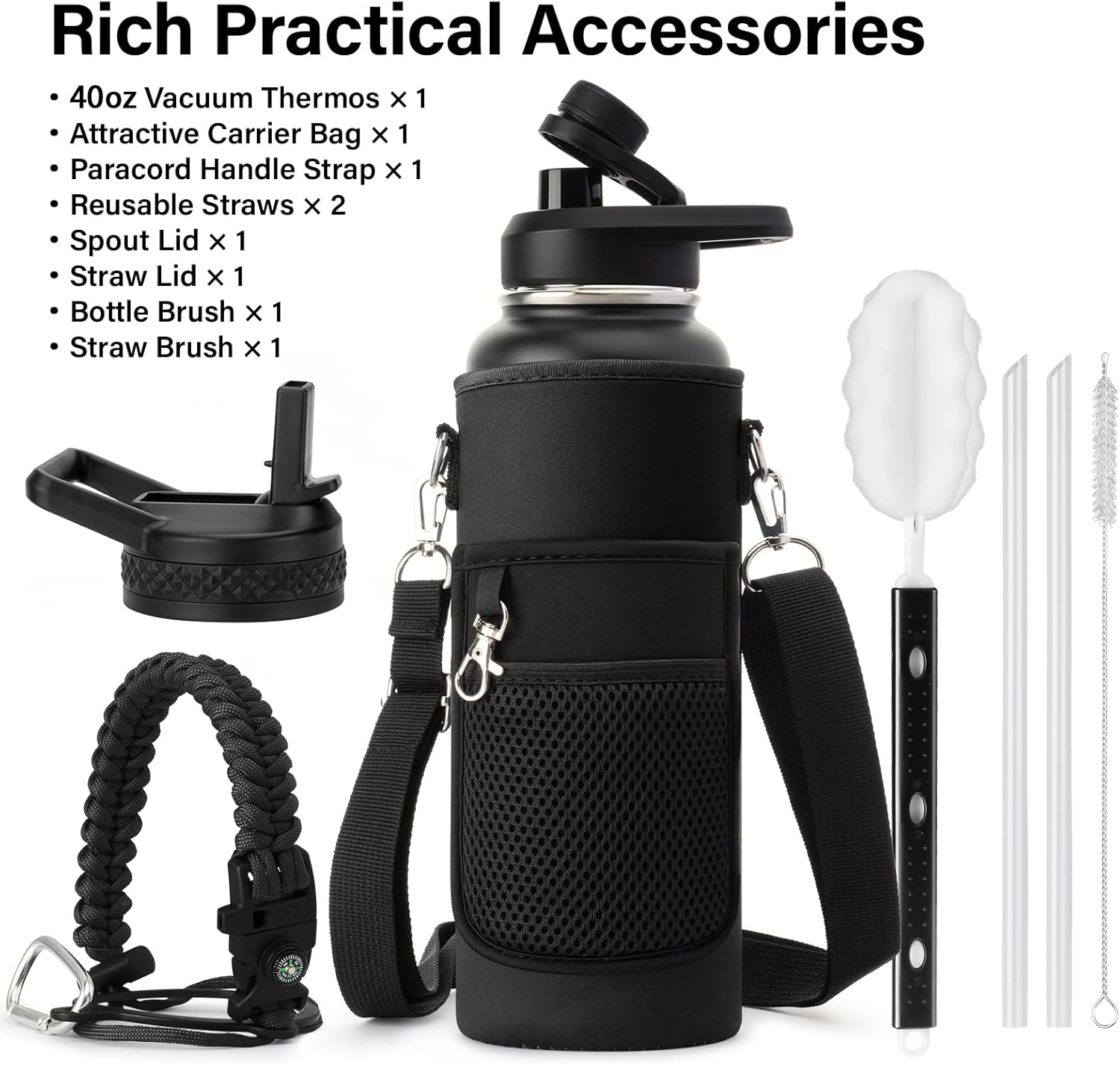 40 oz Insulated Water Bottle | Thickened Stainless Steel Vacuum Metal | Portable Sports Water Jug for Gym and Hiking with Straw, Carrier Bag, Handle Strap | BPA-Free 40 oz, Black