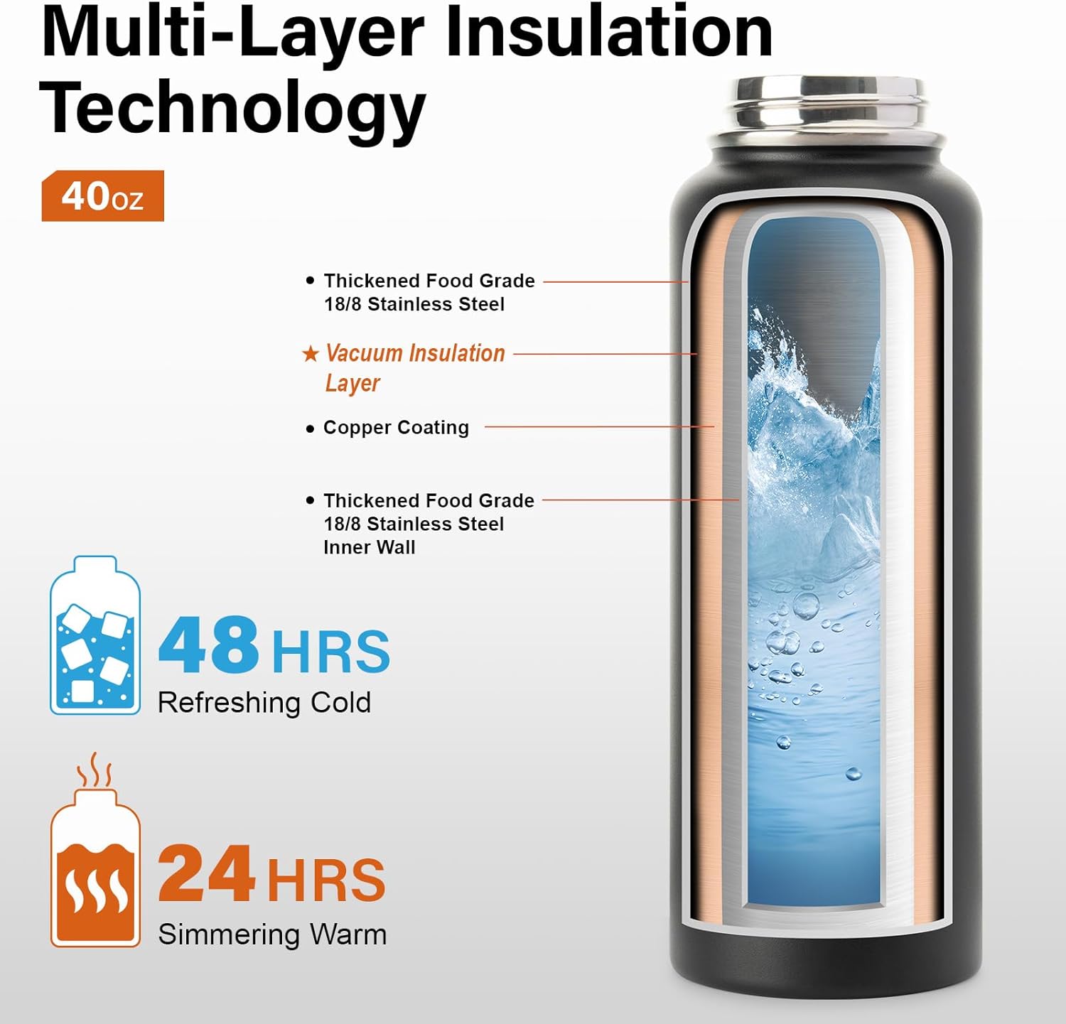 - THE MULTI-LAYER INSULATION TECHNOLOGY FEATURES: the first layer is a thick food-grade 18/8 stainless steel inner wall; the second layer has a copper plating that reduces heat transfer; the third layer is a vacuum layer that prevents heat loss. As a result, you can enjoy an insulated water bottle that keeps beverages cold for up to 48 hours and hot for up to 24 hours, making it perfect for any adventure, whether it's a long hike or a busy workday.