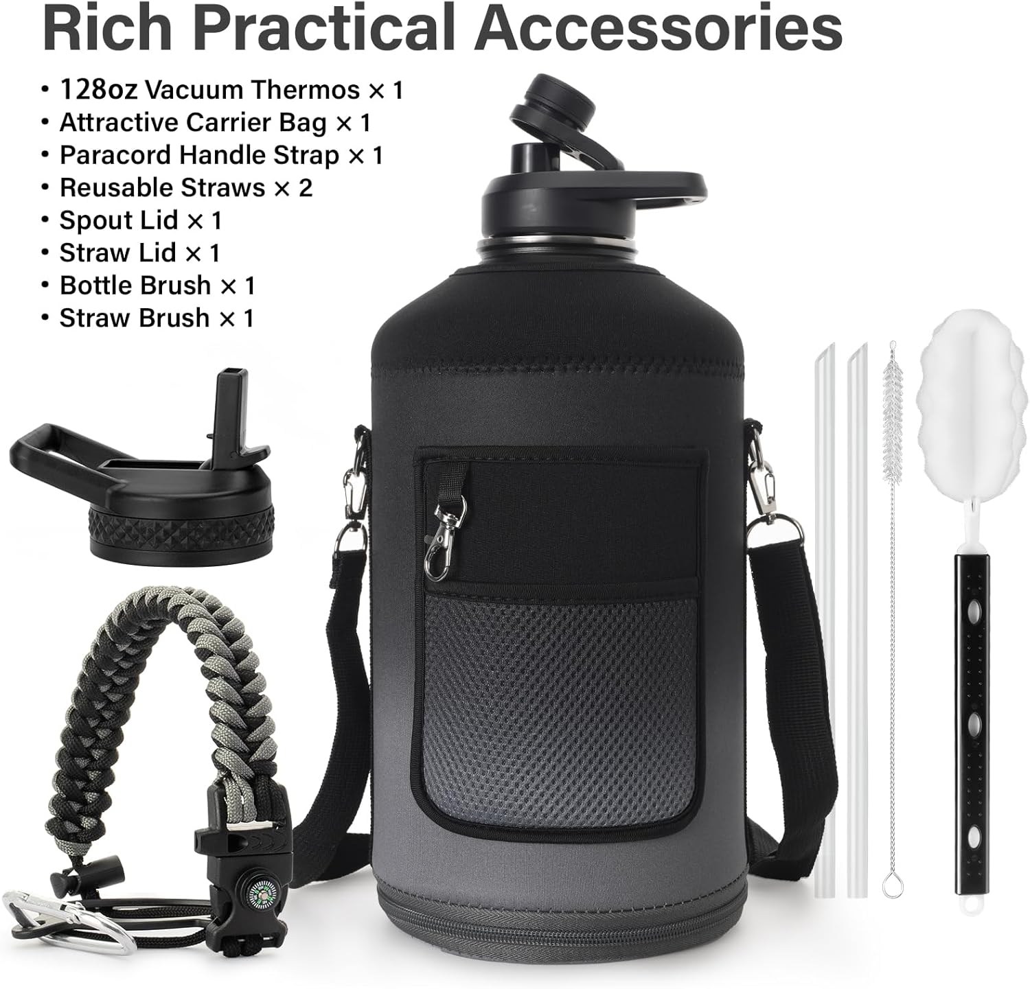 1 Gallon Water Bottle Insulated | Thickened Stainless Steel Vacuum Metal Water Jug | Portable Sports Large for Gym and Hiking with Straw, Carrier Bag, Handle Strap | BPA-Free 128 oz