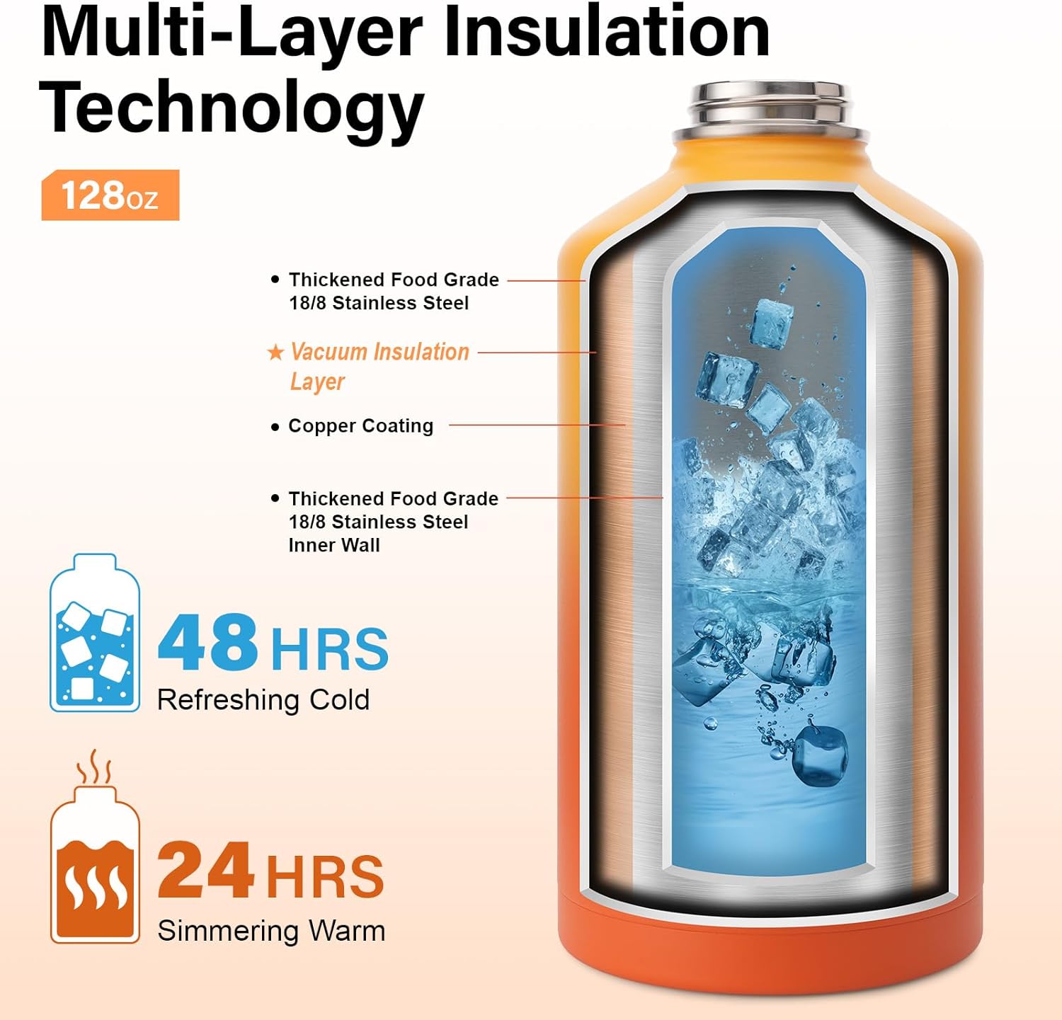 1 Gallon Water Bottle Insulated | Thickened Stainless Steel Vacuum Metal Water Jug | Portable Sports Large for Gym and Hiking with Straw, Carrier Bag, Handle Strap | BPA-Free 128 oz