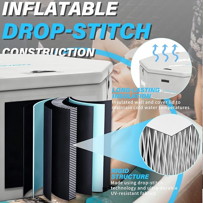 - Durable and Long-Lasting Construction: Crafted from puncture-resistant drop stitch, the ice plunge is built to withstand frequent use and harsh outdoor conditions. The durable material ensures that the tub remains intact and performs well for years, even under high-pressure or extreme temperatures. The high-density insulation and strong seams add to its durability, making it a reliable and long-lasting investment for your wellness routine