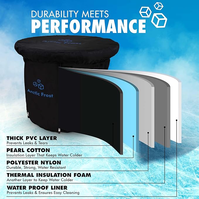 - [Our Ice Baths are built for the toughest ]: Crafted with five durable layers, including nylon polyester, PVC, pearl cotton, and a waterproof coating for superior strength and longevity., our ice bath delivers exceptional durability and stability, outperforming competitors. The robust construction ensures long-lasting reliability for both cold and warm therapies. With its thick insulation maintaining ideal temperatures, it’s perfect for speeding up recovery and boosting mental clarity. Compatible with water chillers, this ice bath is designed to elevate your wellness routine, providing premium therapy for all your recovery needs.