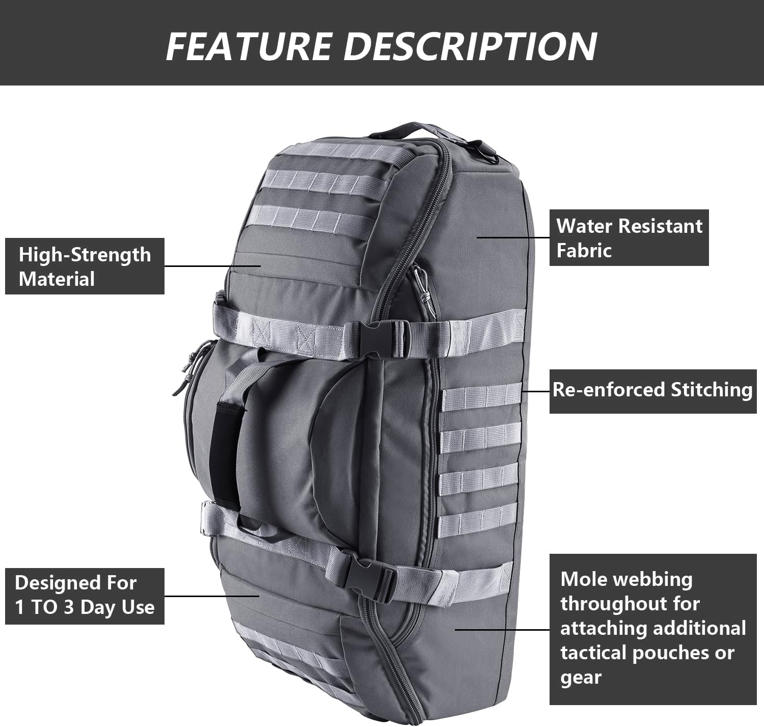 - 3-in-1 LARGE CAPACITY - Large duffle bag size approx.: 26.7"*13"*9.8" / 68*33*25CM (L*W*H) . Capacity:65L. This tactical military assault backpack is made of quality and water-resistant high density fabric. With large capacity allow you to carry all your tactical gears, it can be used as Travel duffle bag, Gym duffle bag, Utility duffle bag and so on.