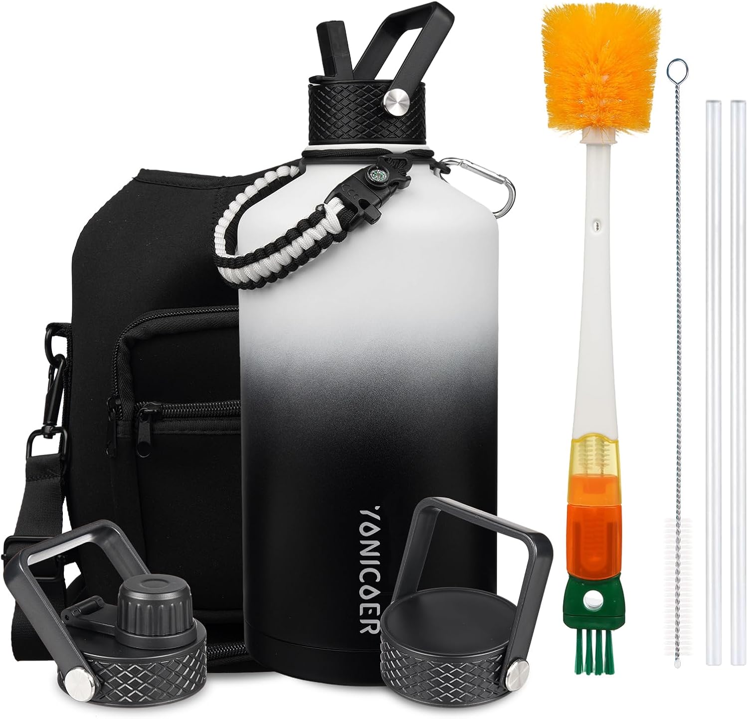 - What you get: We provide continuous after-sales service and 100% customer satisfaction to prevent any leakage or bonding failure. Your purchase includes: YONICOER water bottle, 3 lids, paracord handle, 1 brush, 2 straws, 1 straw brush, 1 cup sleeve