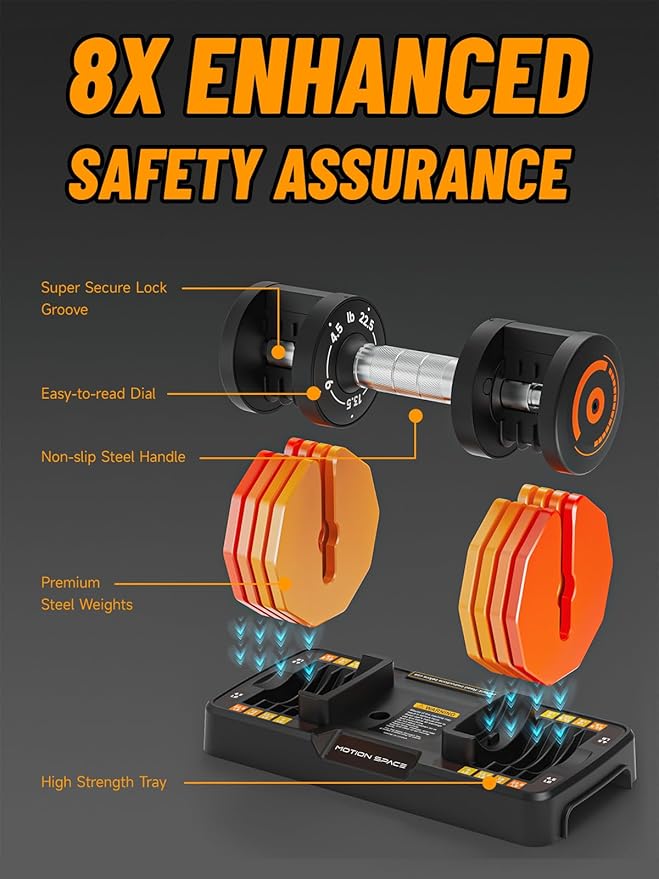 - đ„ăSAFETY DESIGNăWith its innovative count weight plate design, it easily adjusts the weight by holding the handle and turning the pointer to the desired number. Our latest design includes 8 locking mechanisms, providing stability and ensuring safety during workouts.