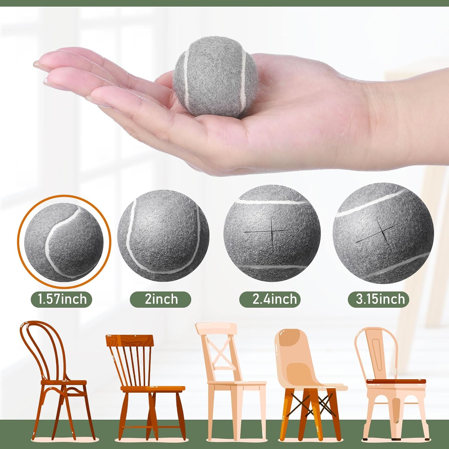 - The Proper Size Provides Different Choices: the size of our precut tennis balls for chairs is about 4 cm/ 1.57 inches in diameter, which is suitable for most table corners, chair corners and stool corners, ideal for round, square, irregular or other strange shape furniture legs