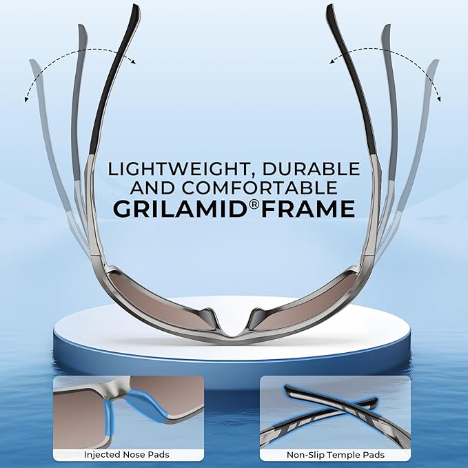- KEY FEATURES – Impact-resistant polarized 1.0mm TAC lenses reduce glare, Block 100% of harmful UVA and UVB rays, Oleophobic and saltwater resistant lens coatings protect mirror finish, Full wrap frame design, Lightweight, durable, and comfortable Grilamid frames, Non-slip temple pads.