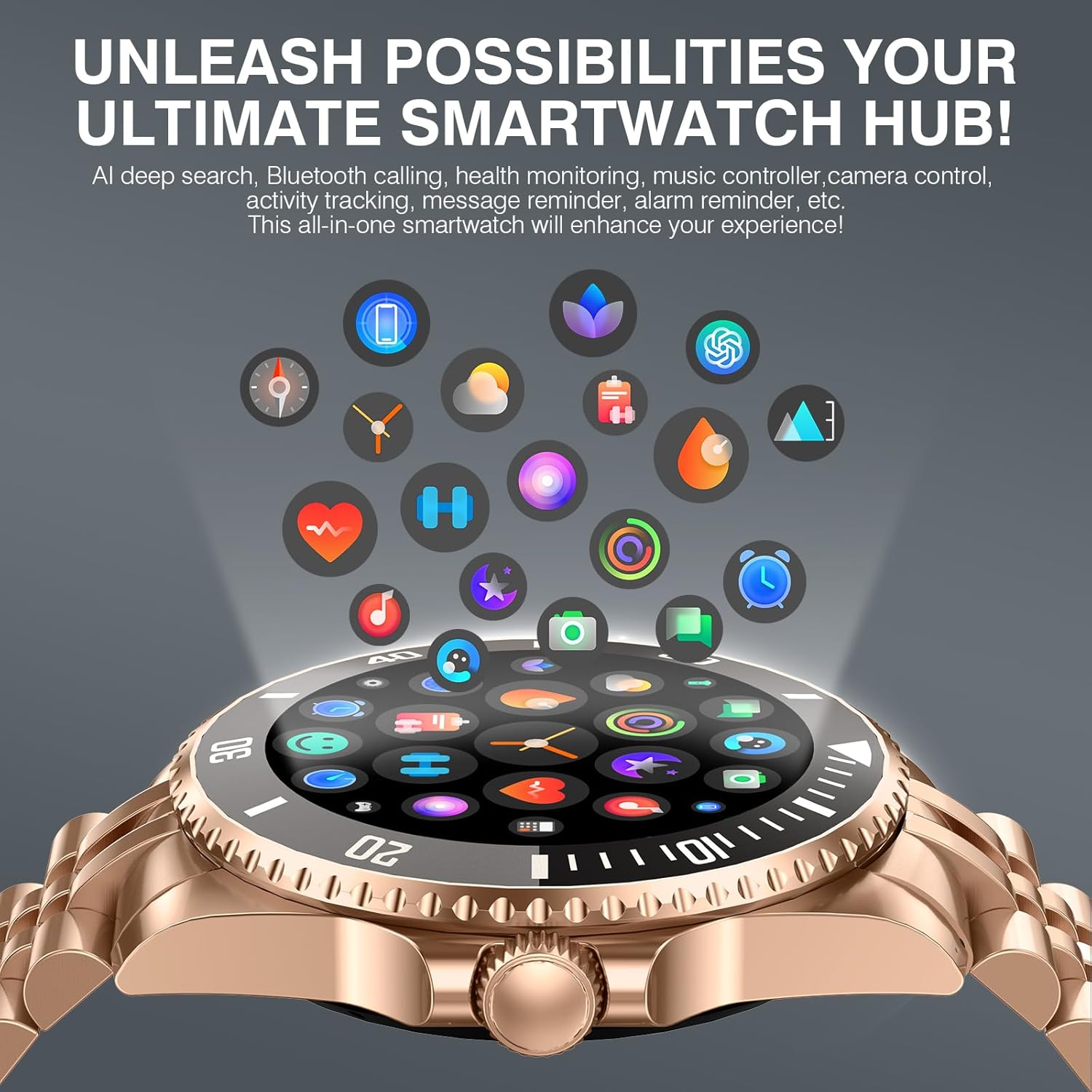2025 DA GPT Smart Watch, Deep Search, Heart Rate, Blood Pressure, Blood Oxygen, Sleep Monitor, 107 Sports Modes, Waterproof Round Watch, 1.19-inch AMOLED Display, Compatible Android and iOS Gold Metal