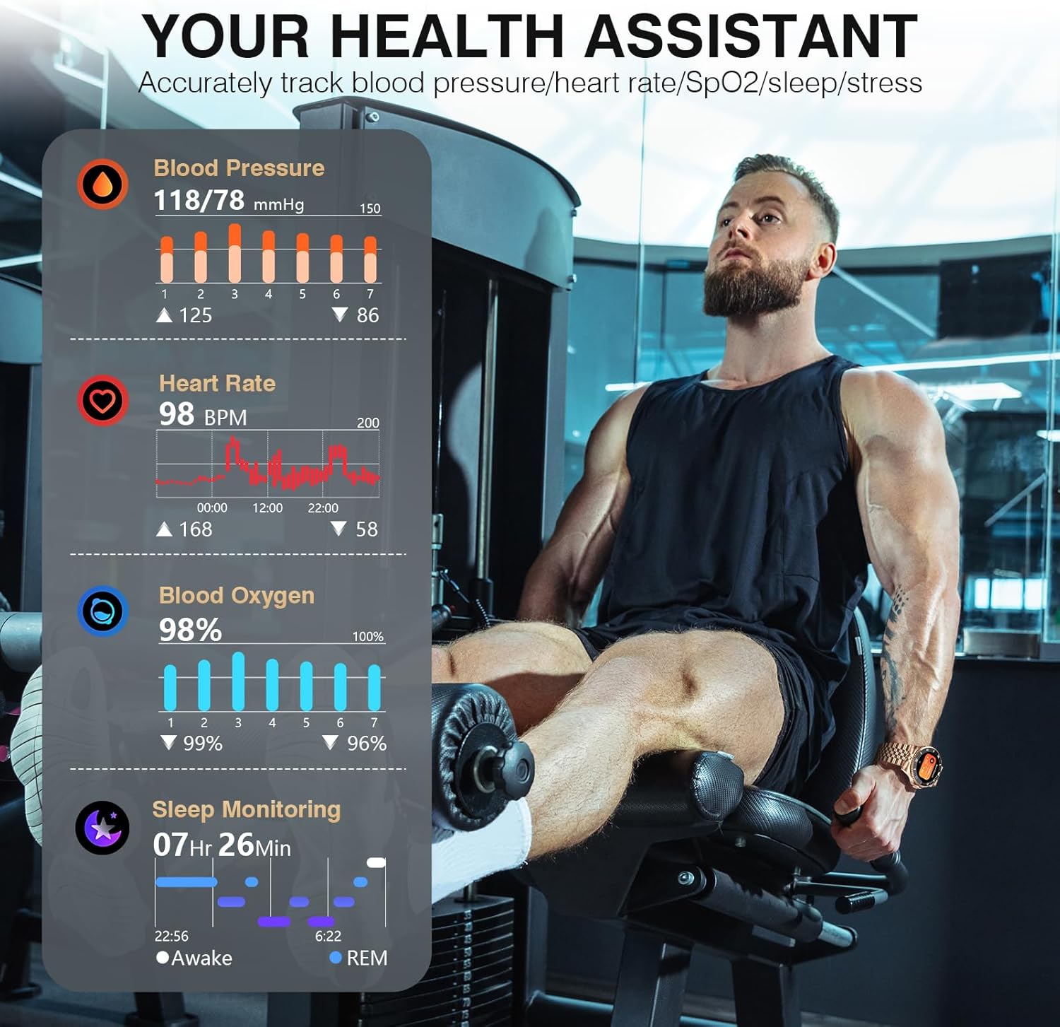 - [Accurate health monitoring]This men's smartwatch is equipped with a VC30F-S chip and uses a dynamic LIS2DOCTR algorithm to accurately monitor heart rate, blood pressure, and blood oxygen 24/7. (Note: This product is not a medical device, and the data is for reference only.) Smart sleep manager: deep sleep/light sleep/wakefulness three-stage recognition, generate sleep quality scores and improvement plans (such as "not enough deep sleep, it is recommended to go to bed 1 hour earlier")
