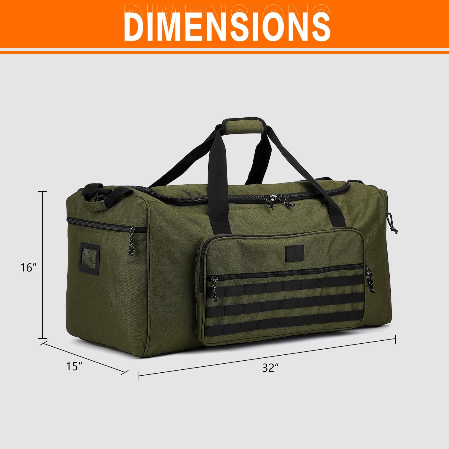 - Tactical Duffel Bag with Big Capacity: Our large weekender travel bag has a size of 32 x 15 x 16 inches and with capacity of 125 liters. With multiple compartments including a ventilated shoe compartment, a side pocket, two front zippered pockets, a inner pocket, and one card slot for organized packing during travel or sports activities.