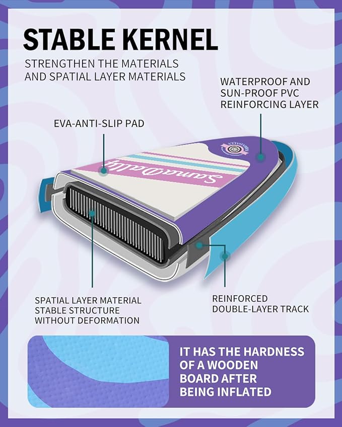 - Spacious & Enjoyable: SamaDally Candy Star series inflatable stand-up paddle boards are 1 to 2 inches wider than other similar products. The 34 - foot paddle surface is extremely spacious. Both beginners and paddleboards enthusiasts can find their own water - based fun on this SUP and enjoy a relaxing time.