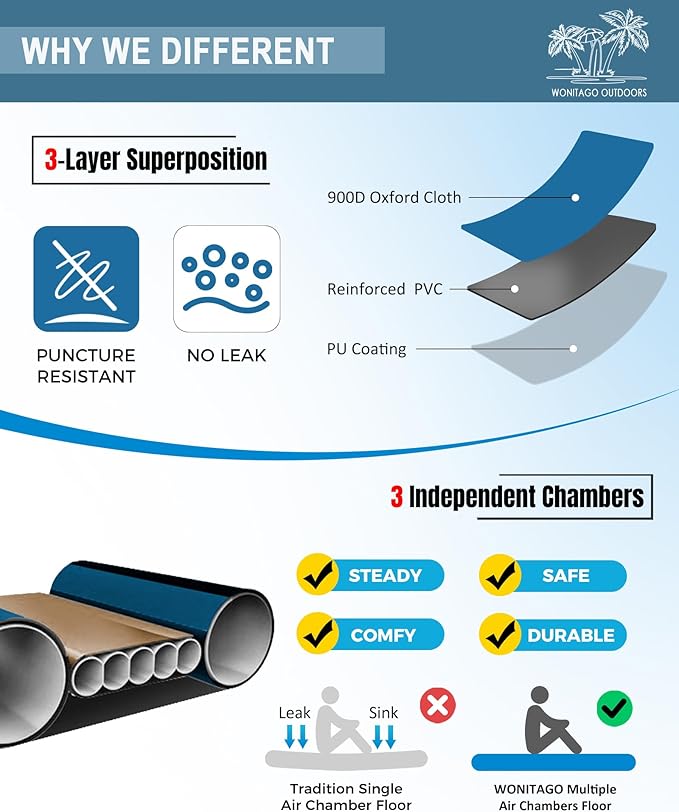 - ENJOY COMFORT JOURNEY --- This inflatable travel kayak's floor can provide comfortable support and flat surface, paired with our inflatable seat cushion, provides better support for your waist. It's ideal for excursion along the river to enjoy the scenery