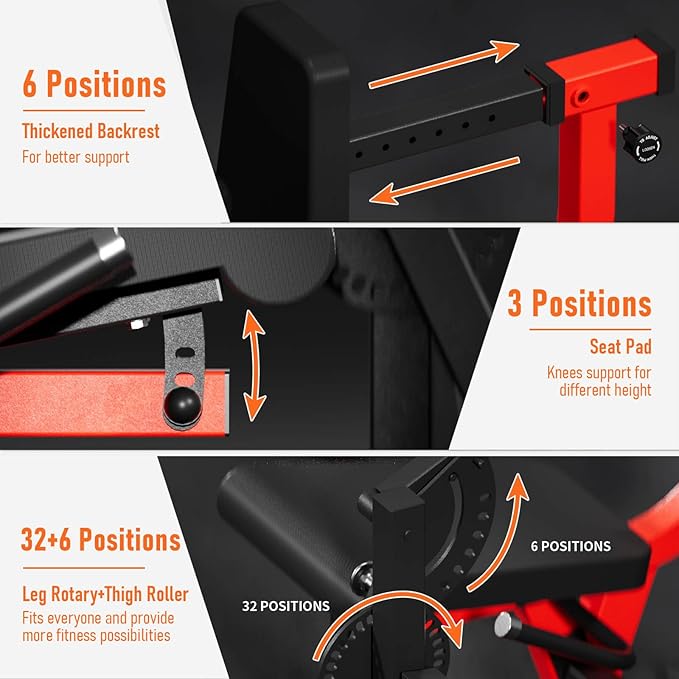 - 【Adjustability for Personalized Training】: 6+32+6+6+3+4 flexible position options for a customized home fitness experience. 6-position thigh holder, 32-position rotary leg extension, 6-position thickened backrest pad, 3-position seat pad and 4-position leg stop, 57 settings ensure all users a perfect fit and enhance your performance.