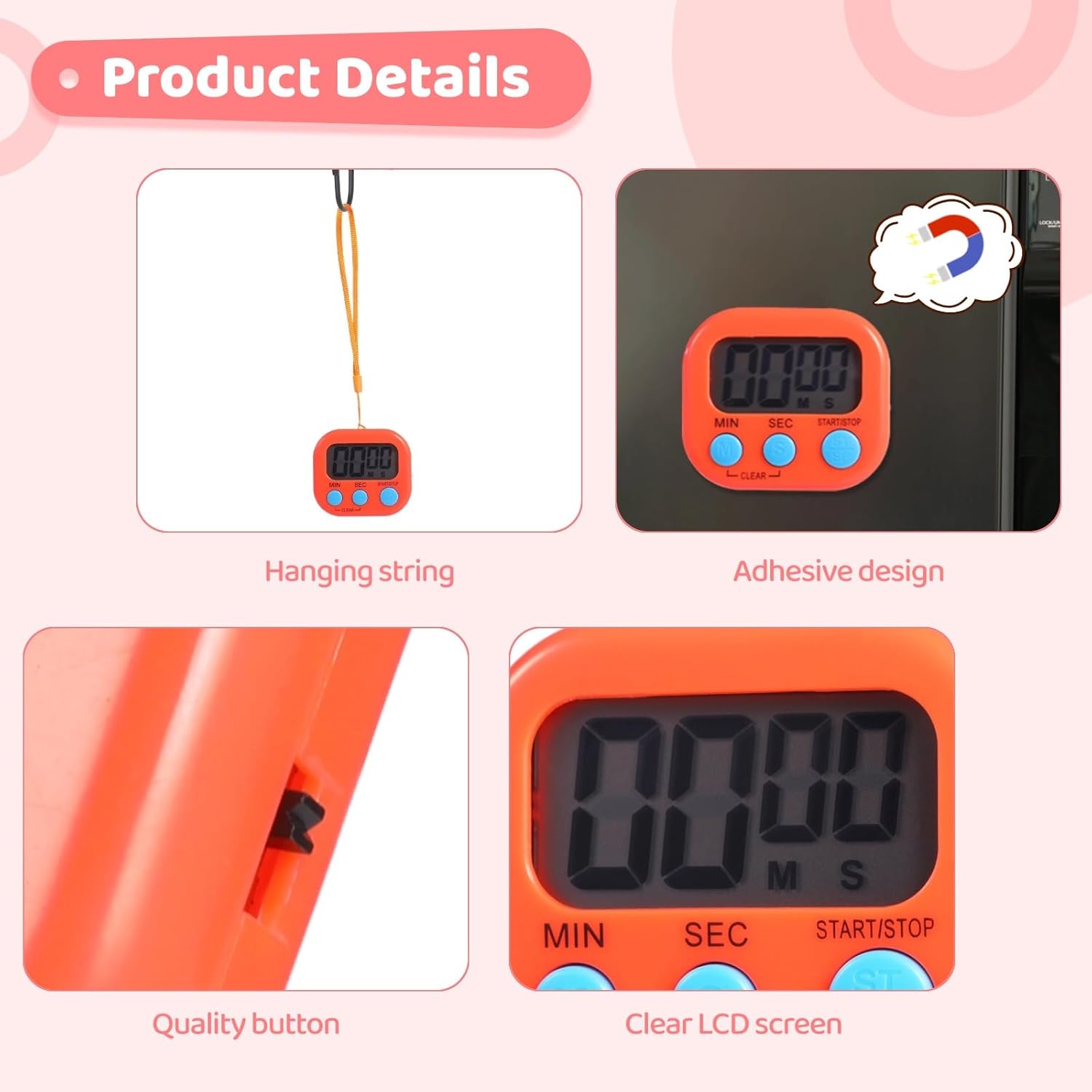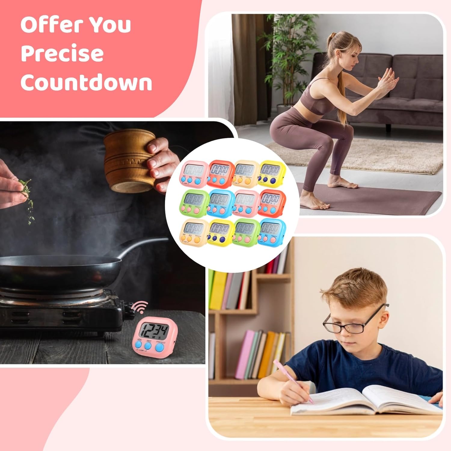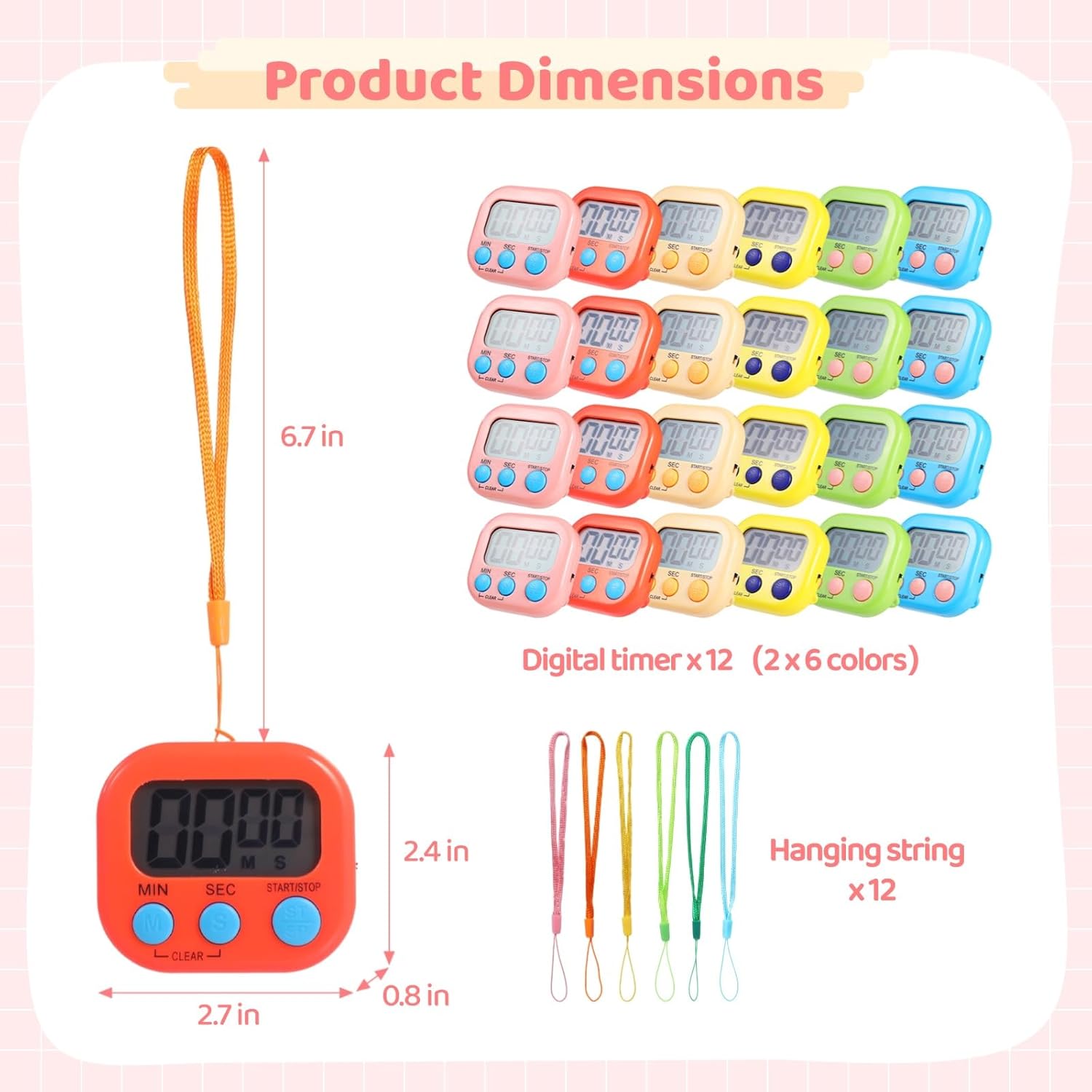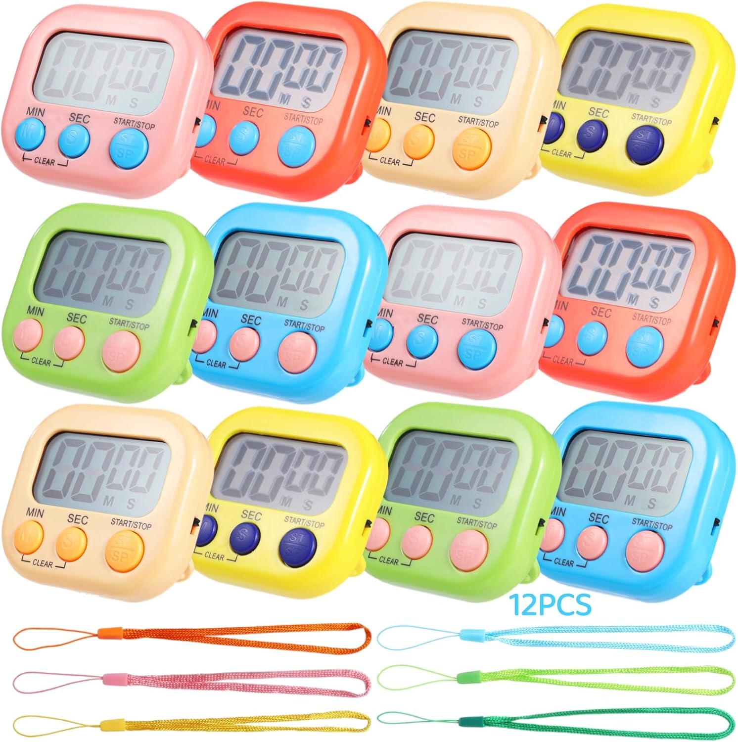 - Versatile Timekeeping: Set includes 12 digital timers in six vibrant colors; perfect for kitchen cooking, classroom activities, sports events, and more; easily distinguish different tasks or groups