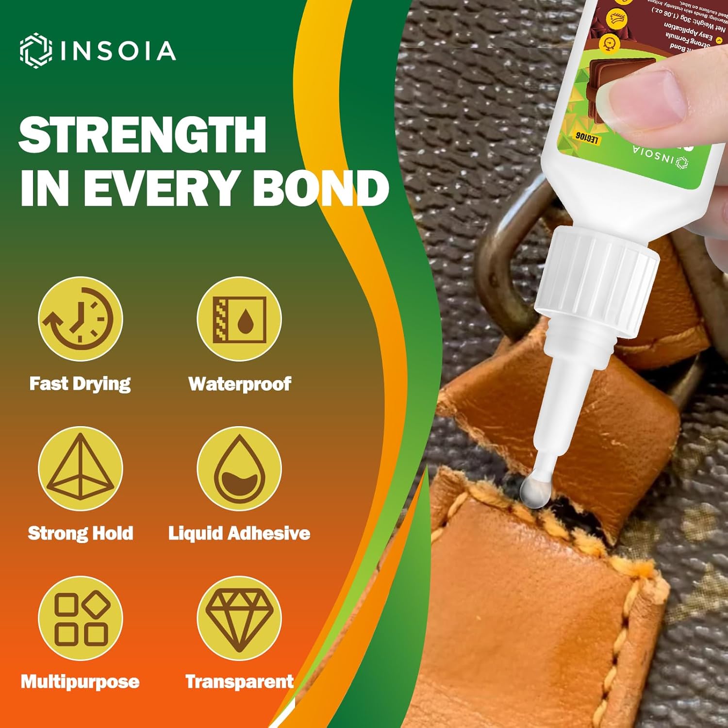 - ăMultipurpose Strong Leather GlueăINSOIA leather adhesive glue is the ultimate solution for diverse bonding challenges. This versatile glue creates enduring bonds across materials like genuine leather-to-leather, leather-to-fabric, leather-to-vinyl, and leather-to-PU surfaces. Whether repairing worn shoes, handbags, jackets, upholstered chairs, car seats, or crafting leather accessories like photo albums and jewelry, our leather clear glue delivers professional-grade results.