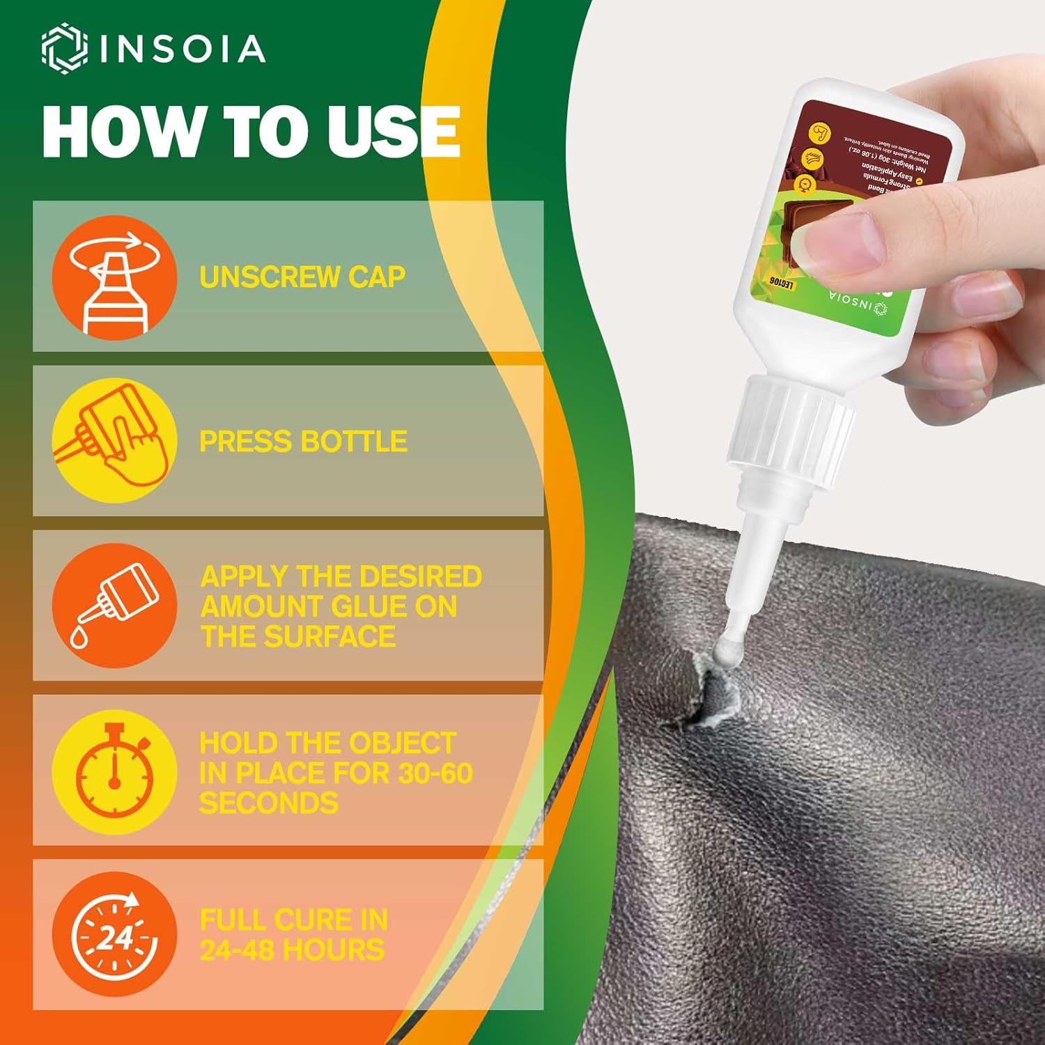 - ăFast-Drying & WaterproofăTime matters, and INSOIA leather adhesive glue delivers. Our super glue for leather bonds genuine leather-to-leather, leather-to-fabric, and leather-to-PU in 10-45 seconds, with full curing in 12-24 hours. The flexible formula withstands bending while maintaining an invisible seamâperfect for repairing handbags, car seats, or crafting leather journals. Professional cobblers and DIYers trust this clear glue for quality repairs.