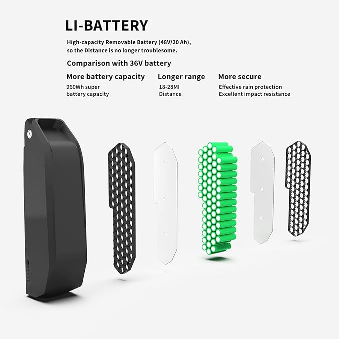 - Ebike with 48V 20Ah removable large capacity lithium battery, 4-6 hours fast charging. Battery is removable, waterproof and convenient to bring home or office for charging.