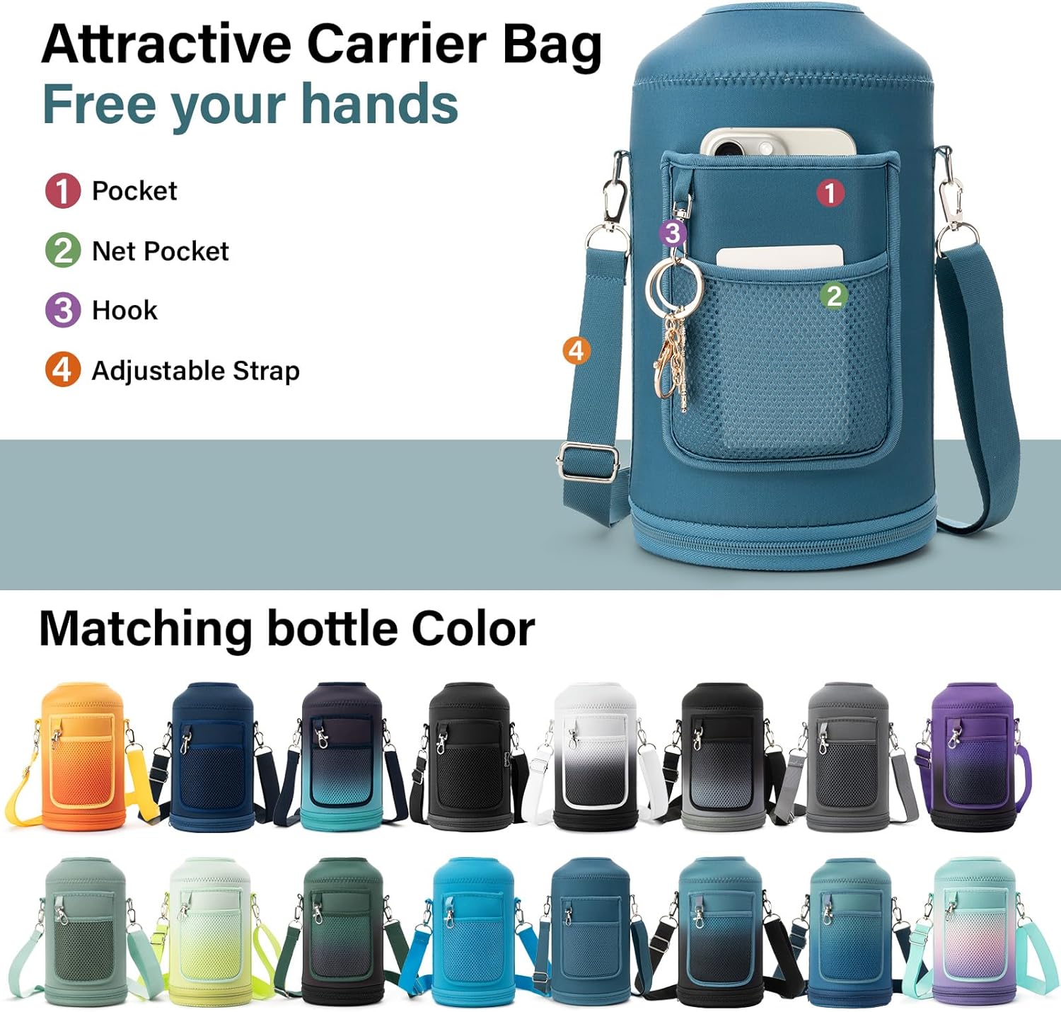 - VERSATILE AND STYLISH CARRIER BAG:The colorful water bottle carrier bag is designed to match the bottle's body, adding a touch of flair while providing practical functionality. The shoulder strap and carabiner make it easy to carry and hang, whether you're out on a hike or running errands. Plus, the small storage bag for your phone and a hook for keys make this bottle even more versatile.