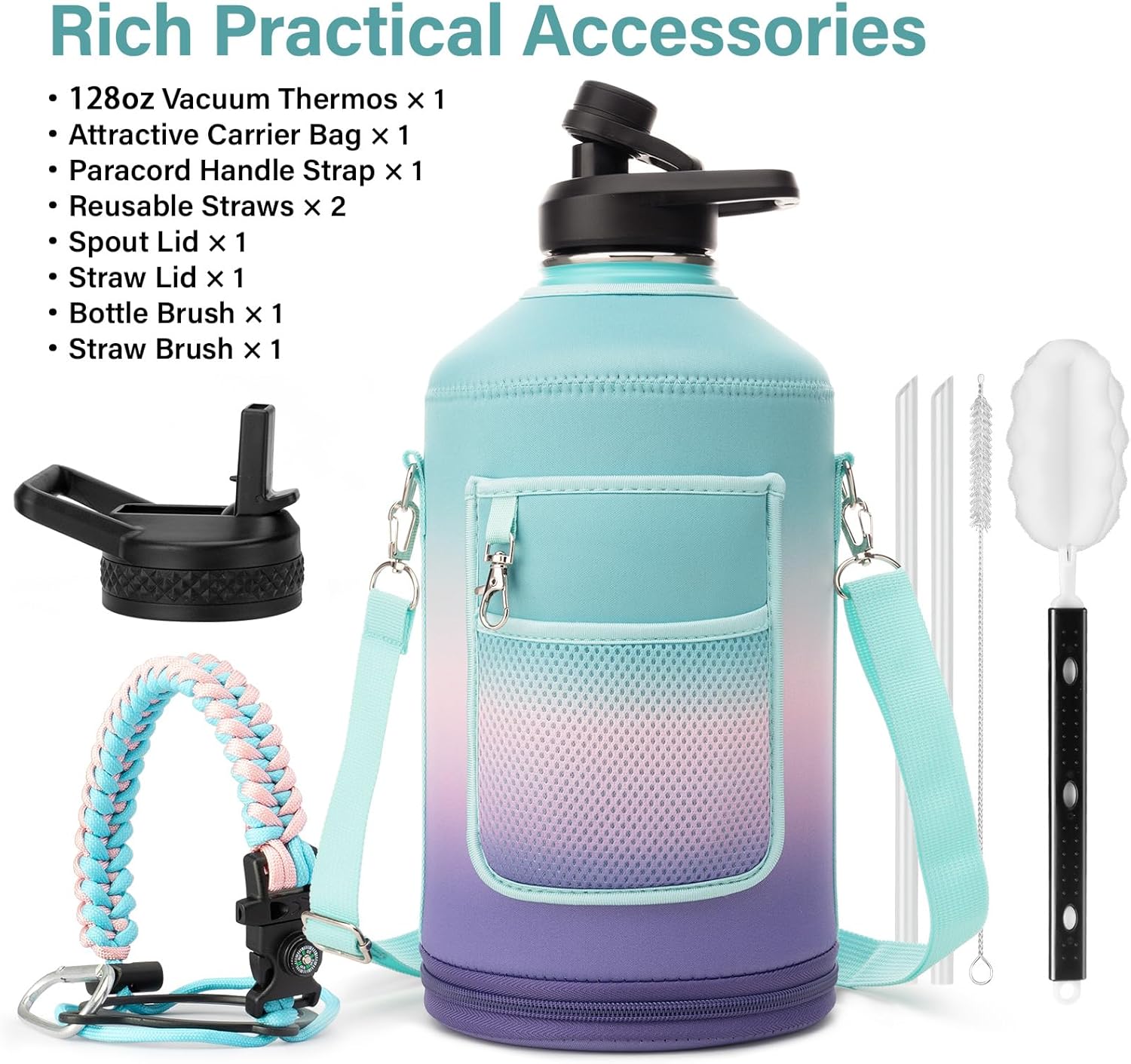 1 Gallon Water Bottle Insulated | Thickened Stainless Steel Vacuum Metal Water Jug | Portable Sports Large for Gym and Hiking with Straw, Carrier Bag, Handle Strap | BPA-Free 128 oz