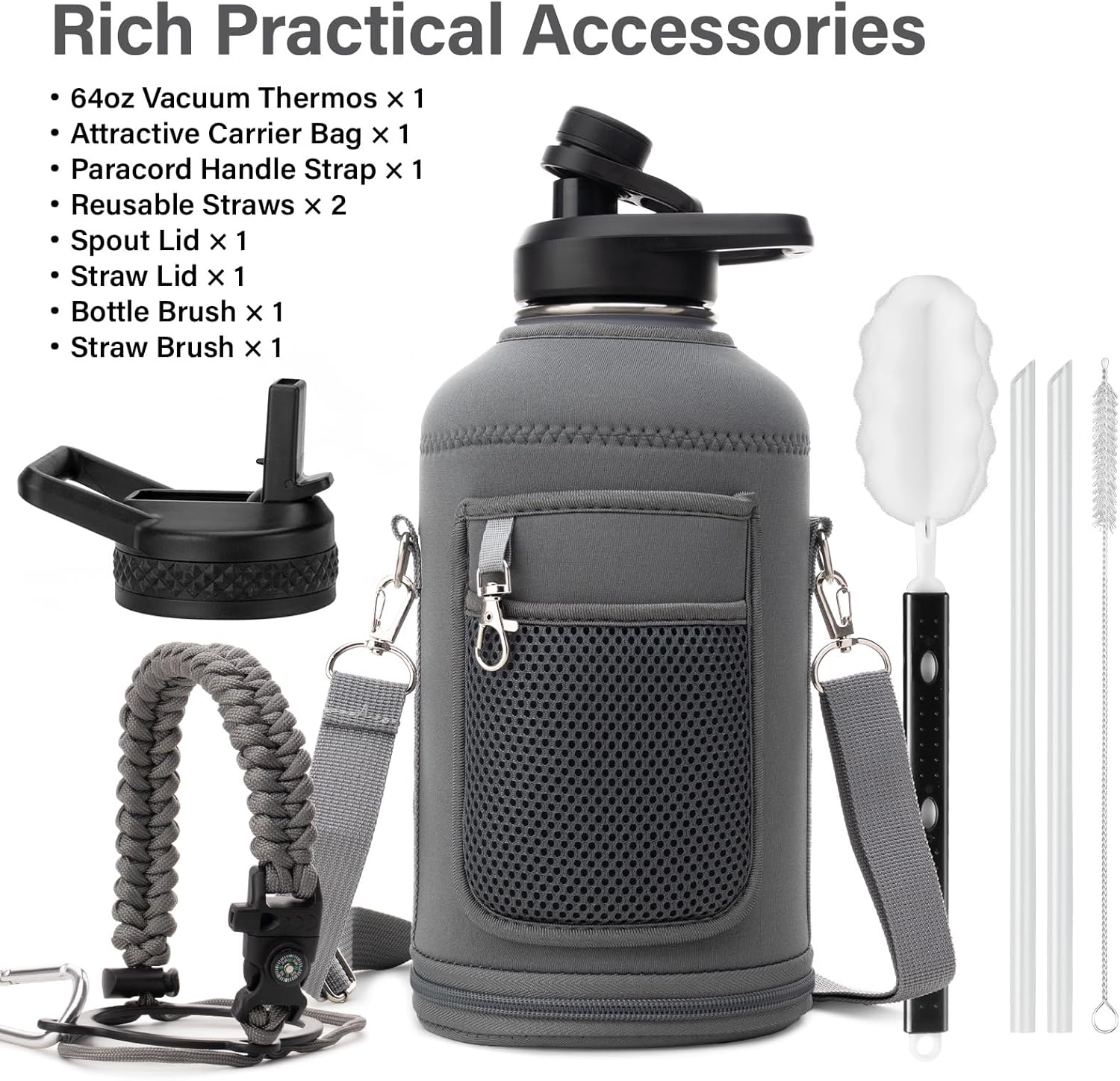 Insulated Water Bottle | Thickened Stainless Steel Vacuum Metal | Portable Sports Half Gallon Large Water Jug for Gym and Hiking with Straw, Carrier Bag, Handle Strap | BPA-Free 64 oz
