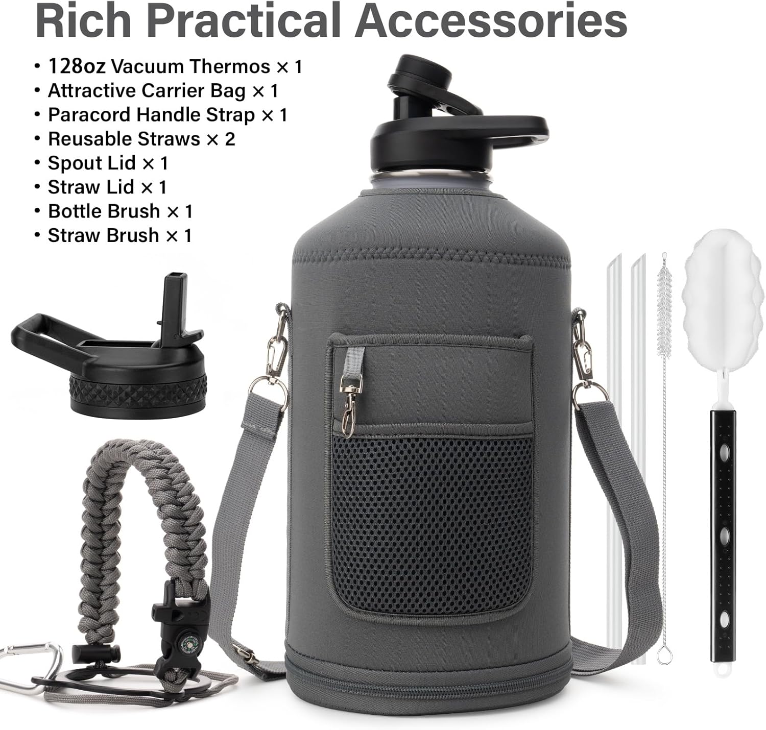 1 Gallon Water Bottle Insulated | Thickened Stainless Steel Vacuum Metal Water Jug | Portable Sports Large for Gym and Hiking with Straw, Carrier Bag, Handle Strap | BPA-Free 128 oz