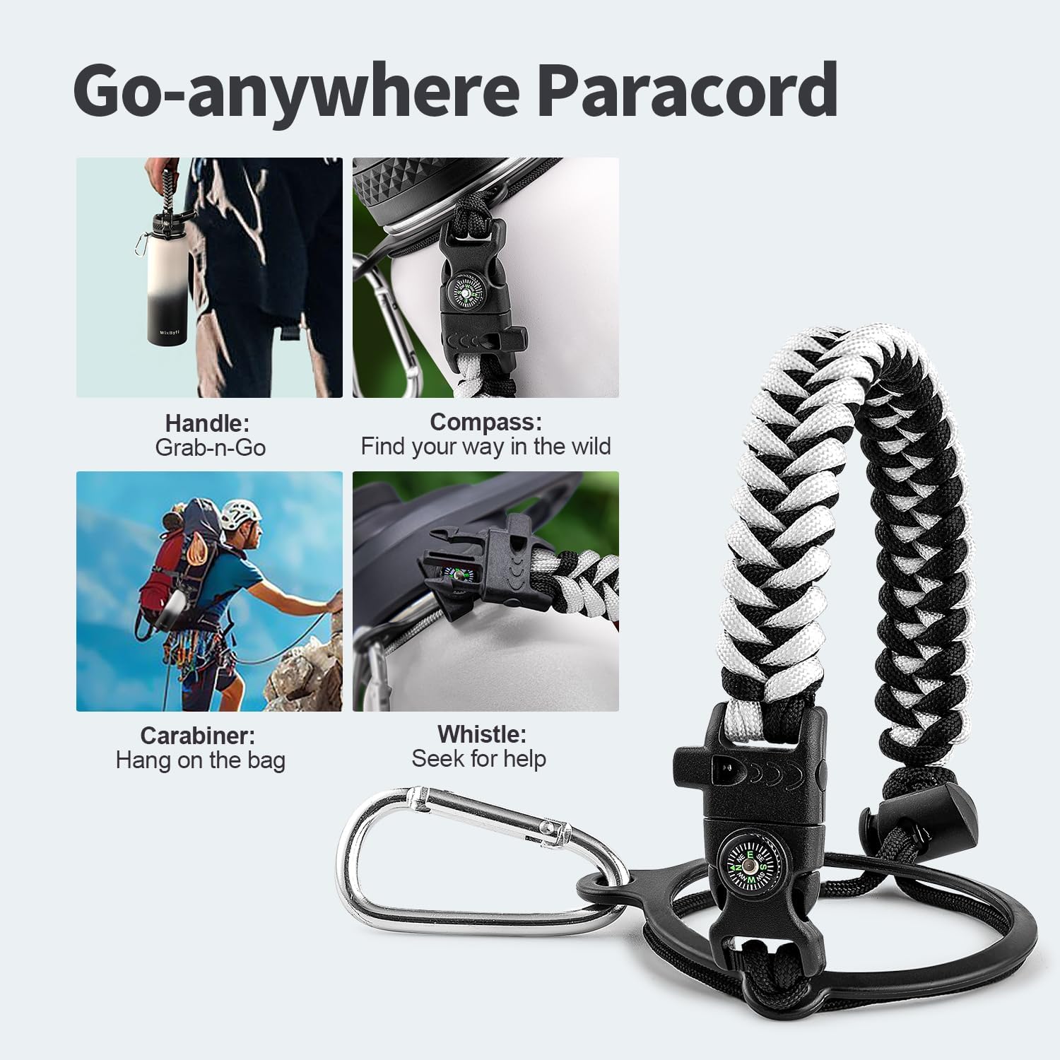 - Palm Fitting Paracord Handle: Compared to handle lids, nylon paracord on the bottle gives you more choices in terms of color coordination and coziness on your hands. Match the handle with your bottle to make a complete outdoorsy look. Compass and carabiner can be lifesavers for hiking and other expeditions