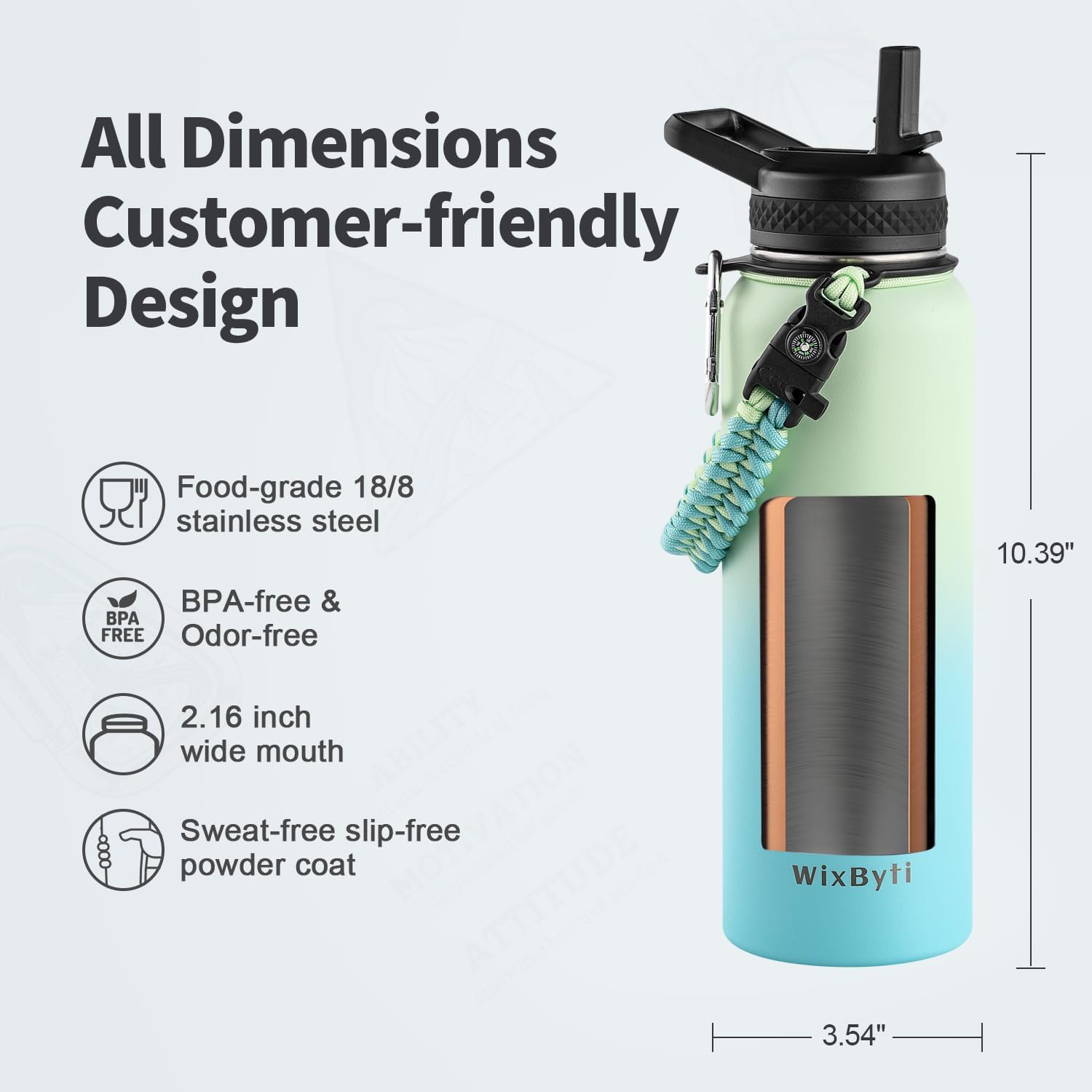 - After Services and Package: We offer continuous after-sales service against leakage and poor cold/hot-keeping capability, we are committed to 100% customer satisfaction. Your purchase includes: WixByti 40oz Water Bottle, Carrying Pouch with Adjustable Strap, Straw Lid with 2 Straws & 1 Straw Brush, Spout Lid, Paracord Handle, Water Bottle Stickers